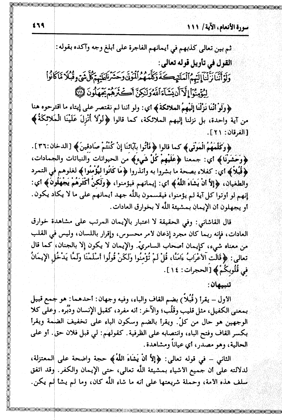 وَلَوْ أَنَّنا نَزَّلْنا إِلَيْهِمُ الْمَلائِكَةَ وَكَلَّمَهُمُ الْمَوْتى وَحَشَرْنا عَلَيْهِمْ كُلَّ شَيْءٍ قُبُلاً ما كانُوا لِيُؤْمِنُوا إِلاَّ أَنْ يَشاءَ اللَّهُ وَلكِنَّ أَكْثَرَهُمْ يَجْهَلُونَ (111)