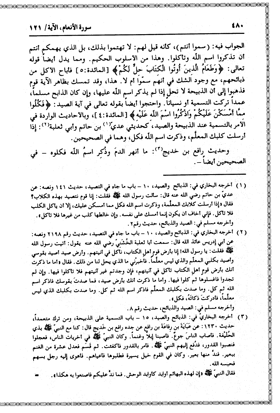 أخرجه البخاريّ في: الذبائح والصيد، 15- باب التسمية على الذبيحة، ومن ترك متعمدا، حديث 1230: عن عباية بن رفاعة بن رافع عن جده رافع بن خديج قال: كنا مع النبيّ صلى الله عليه وسلم بذي الحليفة. فأصاب الناس جوع. فأصبنا إبلا وغنما. وكان النبيّ صلى الله عليه وسلم في أخريات الناس، فعجلوا فنصبوا القدور، فدفع إليهم النبيّ صلى الله عليه وسلم. فأمر بالقدور فأكفئت. ثم قسم فعدل عشرة من الغنم ببعير. فندّ منها بعير. وكان في القوم خيل يسيرة فطلبوها فأعياهم. فأهوى إليه رجل بسهم فحبسه الله.