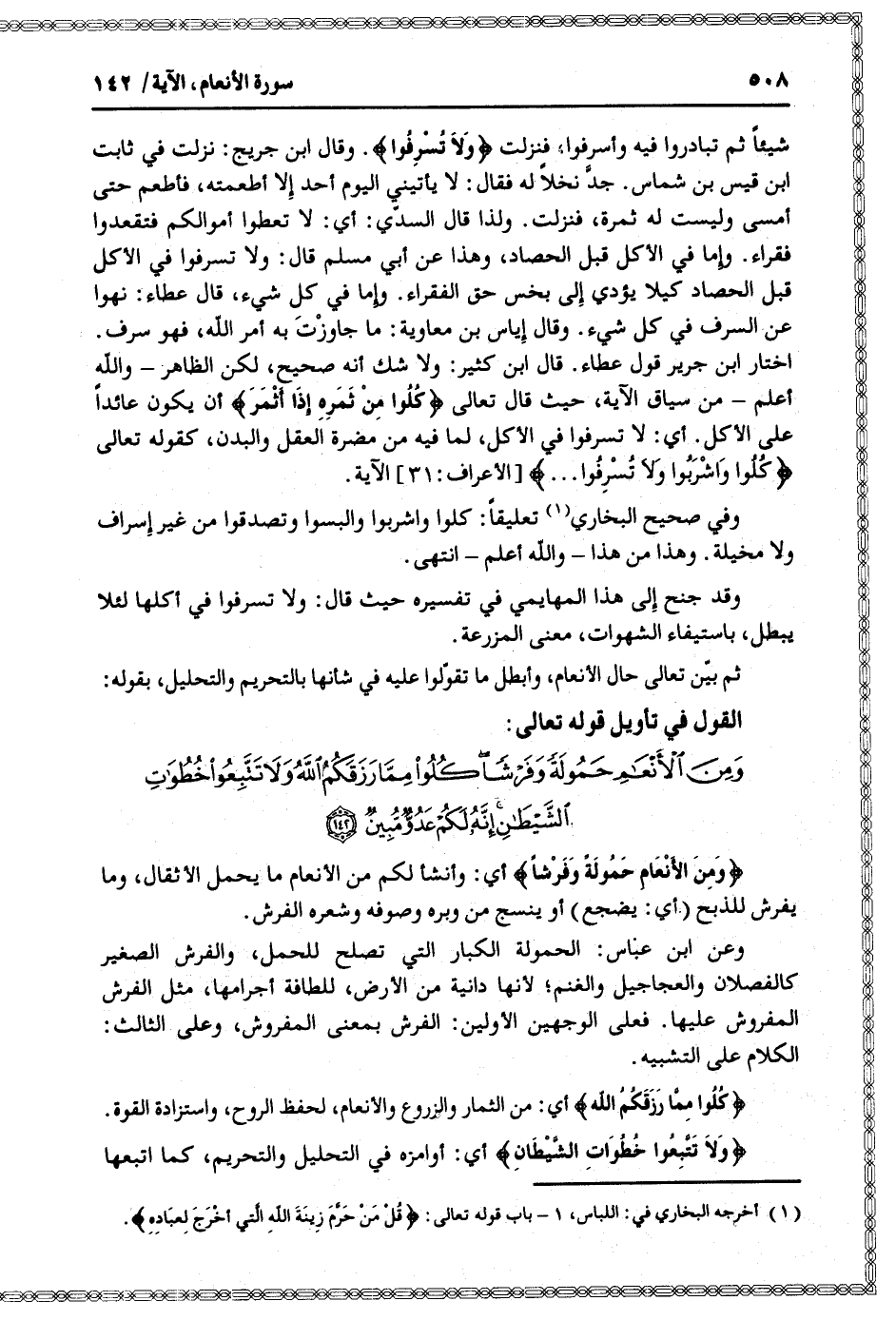 اختار ابن جرير قول عطاء. قال ابن كثير: ولا شك أنه صحيح، لكن الظاهر- والله أعلم- من سياق الآية، حيث قال تعالى كُلُوا مِنْ ثَمَرِهِ إِذا أَثْمَرَ أن يكون عائدا على الأكل. أي: لا تسرفوا في الأكل، لما فيه من مضرة العقل والبدن، كقوله تعالى كُلُوا وَاشْرَبُوا وَلا تُسْرِفُوا ... [الأعراف: 31] الآية.