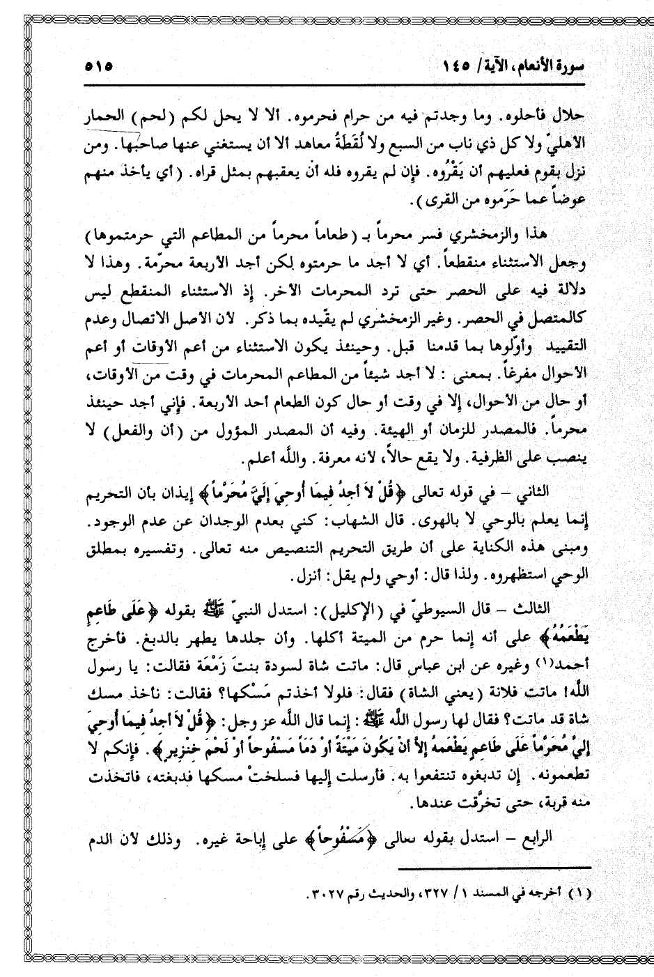 هذا الزمخشري فسر محرما ب (طعاما محرما من المطاعم التي حرمتموها) وجعل الاستثناء منقطعا. أي لا أجد ما حرمتوه لكن أجد الأربعة محرّمة. وهذا لا دلالة فيه على الحصر حتى ترد المحرمات الأخر. إذ الاستثناء المنقطع ليس كالمتصل في الحصر. وغير الزمخشري لم يقيّده بما ذكر. لأن الأصل الاتصال وعدم التقييد وأوّلوها بما قدمنا قبل. وحينئذ يكون الاستثناء من أعم الأوقات أو أعم الأحوال مفرغا. بمعنى: لا أجد شيئا من المطاعم المحرمات في وقت من الأوقات، أو حال من الأحوال، إلا في وقت أو حال كون الطعام أحد الأربعة. فإني أجد حينئذ محرما. فالمصدر للزمان أو الهيئة. وفيه أن المصدر المؤول من (أن والفعل) لا ينصب على الظرفية. ولا يقع حالا، لأنه معرفة. والله أعلم.