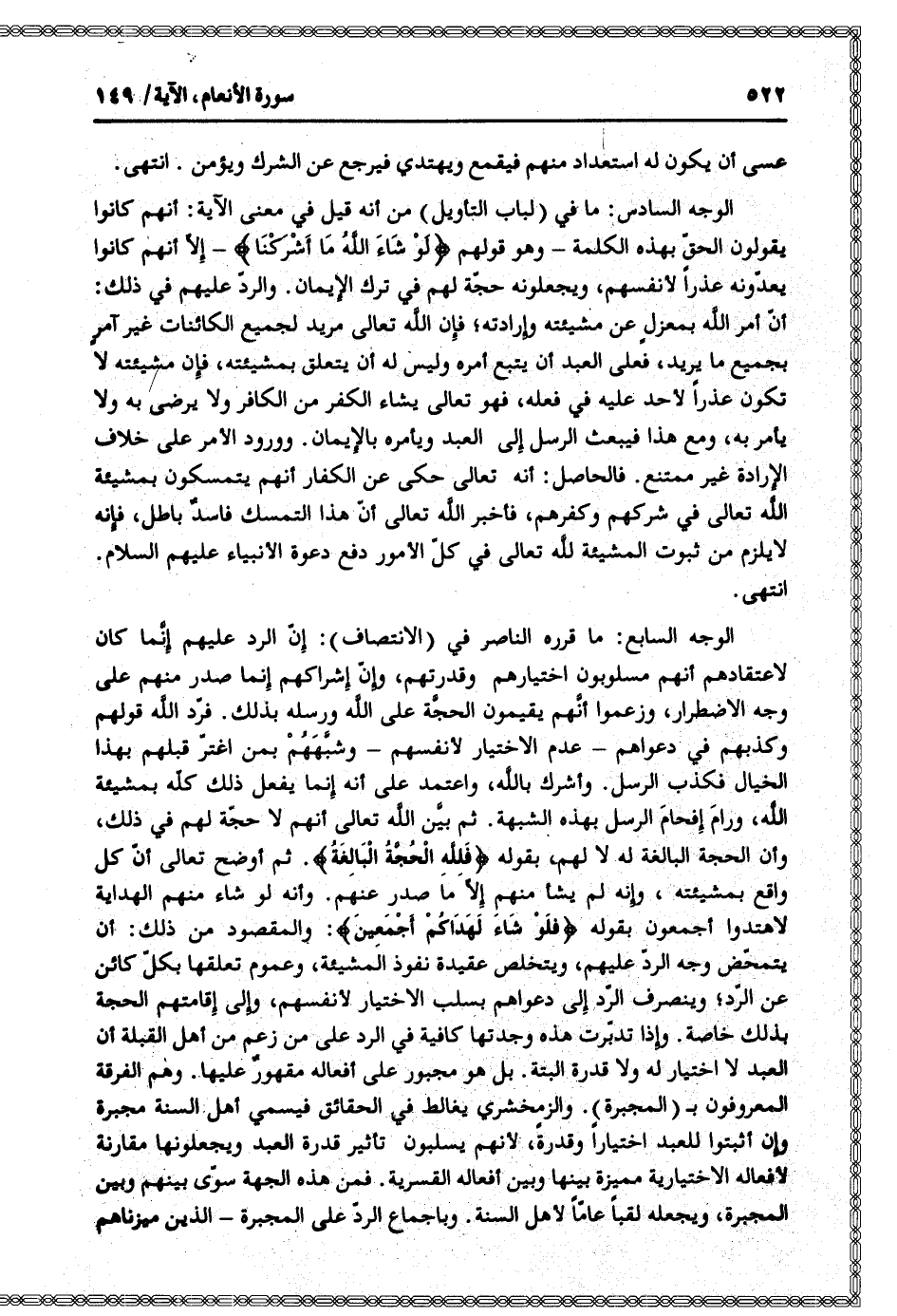 الوجه السابع: ما قرره الناصر في (الانتصاف) : إنّ الرد عليهم إنّما كان لاعتقادهم أنهم مسلوبون اختيارهم وقدرتهم، وإنّ إشراكهم إنما صدر منهم على وجه الاضطرار، وزعموا أنّهم يقيمون الحجّة على الله ورسله بذلك. فردّ الله قولهم وكذبهم في دعواهم- عدم الاختيار لأنفسهم- وشبّههم بمن اغترّ قبلهم بهذا الخيال فكذب الرسل. وأشرك بالله، واعتمد على أنه إنما يفعل ذلك كلّه بمشيئة الله، ورام إفحام الرسل بهذه الشبهة. ثم بيّن الله تعالى أنهم لا حجّة لهم في ذلك، وأن الحجة البالغة له لا لهم، بقوله فَلِلَّهِ الْحُجَّةُ الْبالِغَةُ. ثم أوضح تعالى أنّ كل واقع بمشيئته، وإنه لم يشأ منهم إلّا ما صدر عنهم. وأنه لو شاء منهم الهداية لاهتدوا أجمعون بقوله فَلَوْ شاءَ لَهَداكُمْ أَجْمَعِينَ: والمقصود من ذلك: أن يتمحّض وجه الردّ عليهم، ويتخلص عقيدة نفوذ المشيئة، وعموم تعلقها بكلّ كائن عن الرّد وينصرف الرّد إلى دعواهم بسلب الاختيار لأنفسهم، وإلى إقامتهم الحجة بذلك خاصة. وإذا تدبّرت هذه وجدتها كافية في الرد على من زعم من أهل القبلة أن العبد لا اختيار له ولا قدرة البتة. بل هو مجبور على أفعاله مقهور عليها. وهم الفرقة المعروفون ب (المجبرة) . والزمخشري يغالط في الحقائق فيسمي أهل السنة مجبرة وإن أثبتوا للعبد اختيارا وقدرة، لأنهم يسلبون تأثير قدرة العبد ويجعلونها مقارنة لأفعاله الاختيارية مميزة بينها وبين أفعاله القسرية. فمن هذه الجهة سوّى بينهم وبين المجبرة، ويجعله لقبا عامّا لأهل السنة. وبإجماع الردّ على المجبرة- الذين ميزناهم