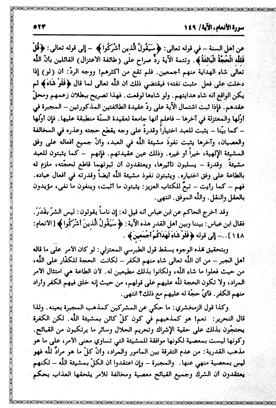 عن أهل السنة- في قوله تعالى: سَيَقُولُ الَّذِينَ أَشْرَكُوا- إلى قوله تعالى: قُلْ فَلِلَّهِ الْحُجَّةُ الْبالِغَةُ. وتتمة الآية ردّ صراح على (طائفة الاعتزال) القائلين بأنّ الله تعالى شاء الهداية منهم أجمعين. فلم تقع من أكثرهم! ووجه الردّ: أن (لو) إذا دخلت على فعل مثبت نفته فيقتضي ذلك أن الله تعالى لما قال فَلَوْ شاءَ لم يكن الواقع أنه شاء هدايتهم. ولو شاءها لوقعت. فهذا تصريح ببطلان زعمهم ومحلّ عقدهم. فإذا ثبت اشتمال الآية على ردّ عقيدة الطائفتين المذكورتين- المجبرة في أوّلها والمعتزلة في آخرها- فاعلم أنها جامعة لعقيدة السنّة منطبقة عليها. فإن أوّلها- كما بيّنا- يثبت للعبد اختيارا وقدرة على وجه يقطع حجته وعذره في المخالفة والعصيان، وآخرها يثبت نفوذ مشيئة الله في العبد، وأنّ جميع أفعاله على وفق المشيئة الإلهية، خيرا أو غيره. وذلك عين عقيدتهم. فإنهم- كما يثبتون للعبد مشيئة وقدرة- يسلبون تأثيرها، ويعتقدون أن ثبوتهما قاطع لحجّته، ملزم له بالطاعة على وفق اختياره. ويثبتون نفوذ مشيئة الله أيضا وقدرته في أفعال عباده.