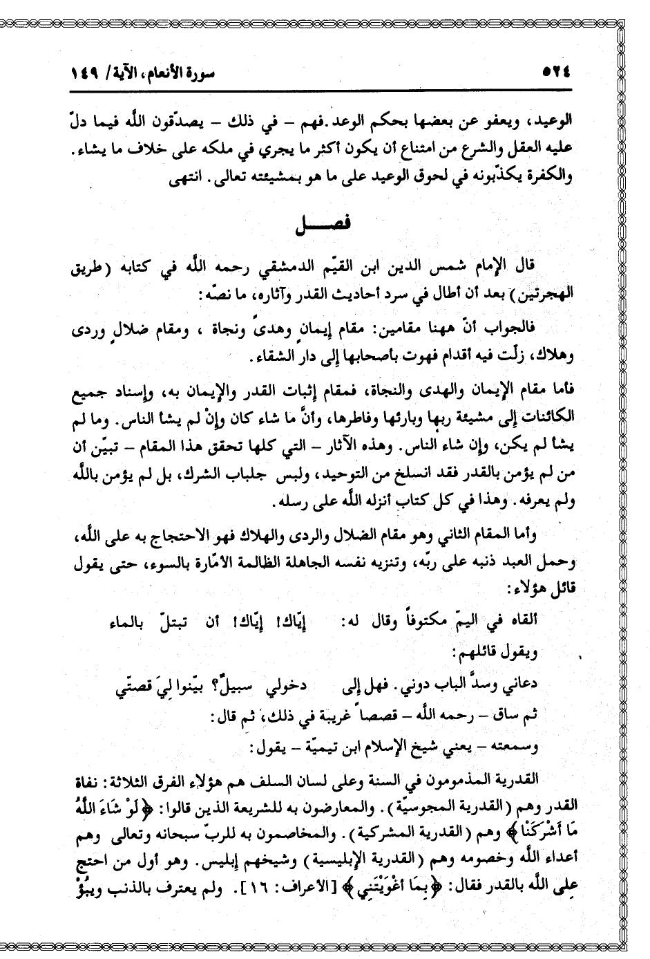 قال الإمام شمس الدين ابن القيّم الدمشقي رحمه الله في كتابه (طريق الهجرتين) بعد أن أطال في سرد أحاديث القدر وآثاره، ما نصّه: