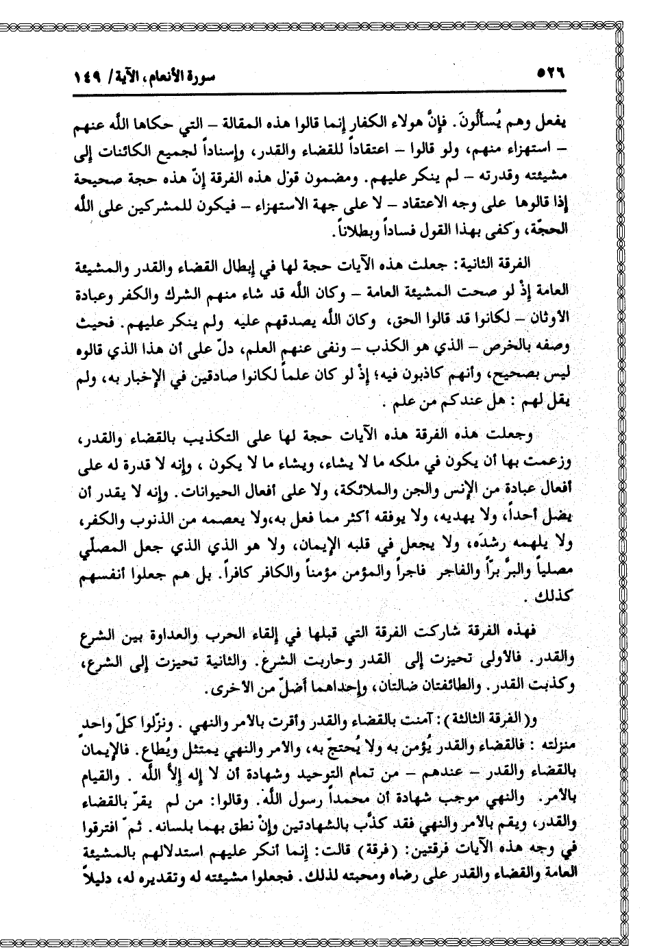 و (الفرقة الثالثة) : آمنت بالقضاء والقدر وأقرت بالأمر والنهي. ونزّلوا كلّ واحد منزلته: فالقضاء والقدر يؤمن به ولا يحتجّ به، والأمر والنهي يمتثل ويطاع. فالإيمان بالقضاء والقدر- عندهم- من تمام التوحيد وشهادة أن لا إله إلّا الله. والقيام بالأمر. والنهي موجب شهادة أن محمدا رسول الله. وقالوا: من لم يقرّ بالقضاء والقدر، ويقم بالأمر والنهي فقد كذّب بالشهادتين وإن نطق بهما بلسانه. ثمّ افترقوا في وجه هذه الآيات فرقتين: (فرقة) قالت: إنما أنكر عليهم استدلالهم بالمشيئة العامة والقضاء والقدر على رضاه ومحبته لذلك. فجعلوا مشيئته له وتقديره له، دليلا