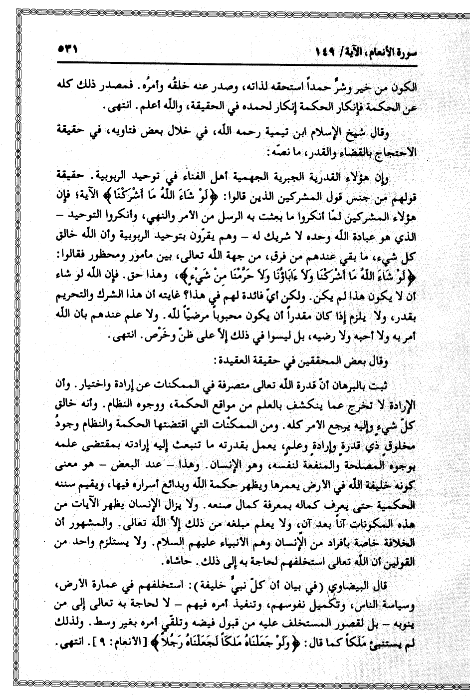 وقال شيخ الإسلام ابن تيمية رحمه الله، في خلال بعض فتاويه، في حقيقة الاحتجاج بالقضاء والقدر، ما نصّه: