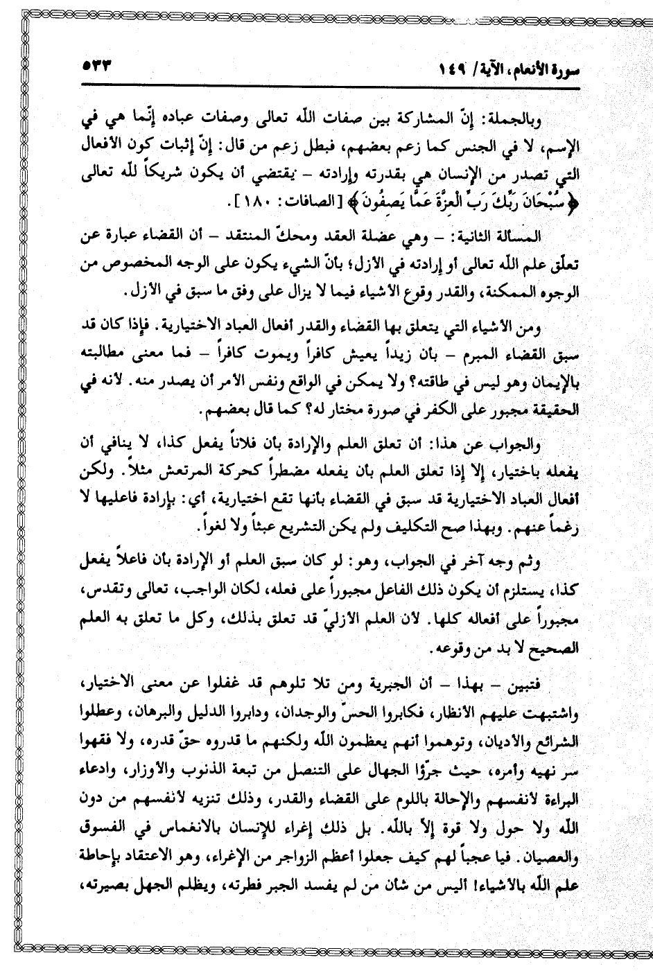 فتبين- بهذا- أن الجبرية ومن تلا تلوهم قد غفلوا عن معنى الاختيار، واشتبهت عليهم الأنظار، فكابروا الحسّ والوجدان، ودابروا الدليل والبرهان، وعطلوا الشرائع والأديان، وتوهموا أنهم يعظمون الله ولكنهم ما قدروه حقّ قدره، ولا فقهوا سر نهيه وأمره، حيث جرّءوا الجهال على التنصل من تبعة الذنوب والأوزار، وادعاء البراءة لأنفسهم والإحالة باللوم على القضاء والقدر، وذلك تنزيه لأنفسهم من دون الله ولا حول ولا قوة إلّا بالله. بل ذلك إغراء للإنسان بالانغماس في الفسوق والعصيان. فيا عجبا لهم كيف جعلوا أعظم الزواجر من الإغراء، وهو الاعتقاد بإحاطة علم الله بالأشياء! أليس من شأن من لم يفسد الجبر فطرته، ويظلم الجهل بصيرته،
