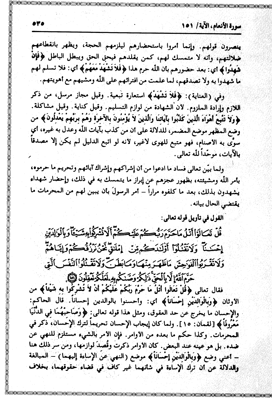 قُلْ تَعالَوْا أَتْلُ ما حَرَّمَ رَبُّكُمْ عَلَيْكُمْ أَلاَّ تُشْرِكُوا بِهِ شَيْئاً وَبِالْوالِدَيْنِ إِحْساناً وَلا تَقْتُلُوا أَوْلادَكُمْ مِنْ إِمْلاقٍ نَحْنُ نَرْزُقُكُمْ وَإِيَّاهُمْ وَلا تَقْرَبُوا الْفَواحِشَ ما ظَهَرَ مِنْها وَما بَطَنَ وَلا تَقْتُلُوا النَّفْسَ الَّتِي حَرَّمَ اللَّهُ إِلاَّ بِالْحَقِّ ذلِكُمْ وَصَّاكُمْ بِهِ لَعَلَّكُمْ تَعْقِلُونَ (151)