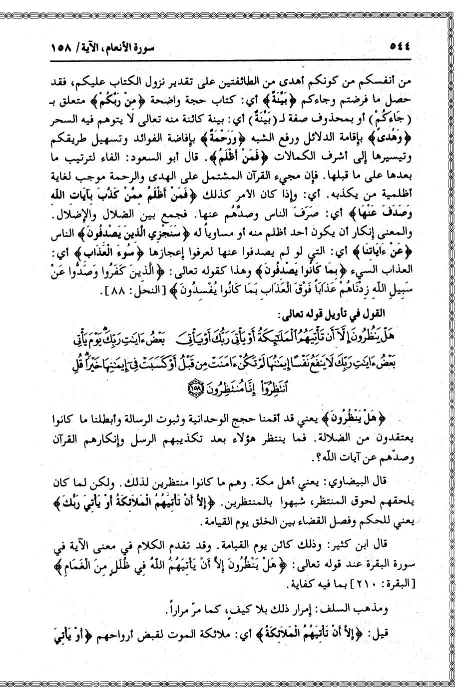 هَلْ يَنْظُرُونَ إِلاَّ أَنْ تَأْتِيَهُمُ الْمَلائِكَةُ أَوْ يَأْتِيَ رَبُّكَ أَوْ يَأْتِيَ بَعْضُ آياتِ رَبِّكَ يَوْمَ يَأْتِي بَعْضُ آياتِ رَبِّكَ لا يَنْفَعُ نَفْساً إِيمانُها لَمْ تَكُنْ آمَنَتْ مِنْ قَبْلُ أَوْ كَسَبَتْ فِي إِيمانِها خَيْراً قُلِ انْتَظِرُوا إِنَّا مُنْتَظِرُونَ (158)