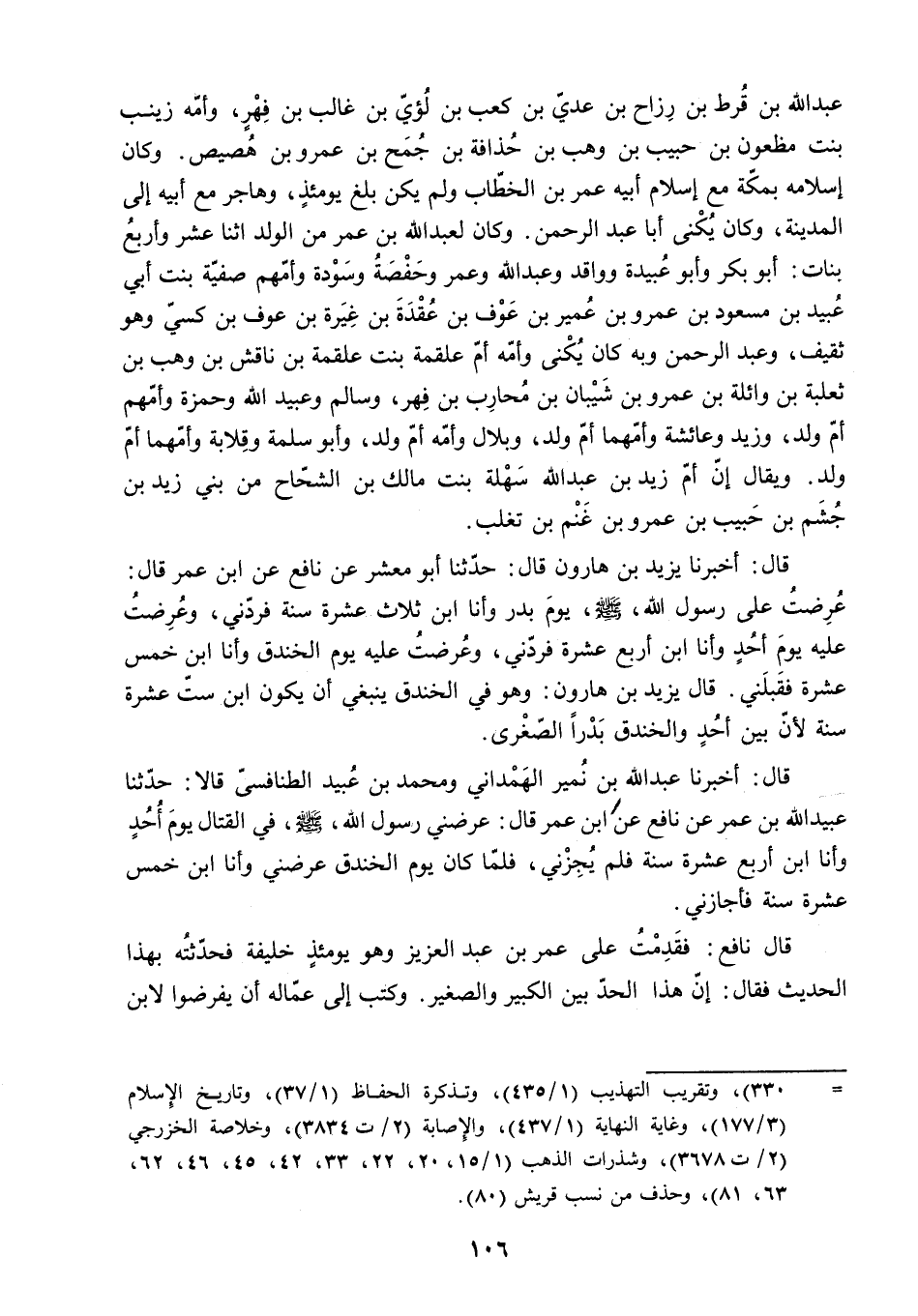 قَالَ: أَخْبَرَنَا عَبْدُ اللَّهِ بْنُ نُمَيْرٍ الْهَمْدَانِيُّ وَمُحَمَّدُ بْنُ عُبَيْدٍ الطَّنَافِسِيُّ قَالا: حَدَّثَنَا عُبَيْدُ اللَّهِ بْنُ عُمَرَ عَنْ نَافِعٍ عن ابن عُمَرَ قَالَ: عَرَضَنِي رَسُولُ اللَّهِ - صَلَّى اللَّهُ عَلَيْهِ وَسَلَّمَ - فِي الْقِتَالِ يَوْمَ أُحُدٍ وَأَنَا ابْنُ أَرْبَعَ عَشْرَةَ سَنَةً فَلَمْ يُجِزْنِي. فَلَمَّا كَانَ يَوْمُ الْخَنْدَقِ عَرَضَنِي وَأَنَا ابْنُ خَمْسَ عَشْرَةَ سَنَةً فَأَجَازَنِي.