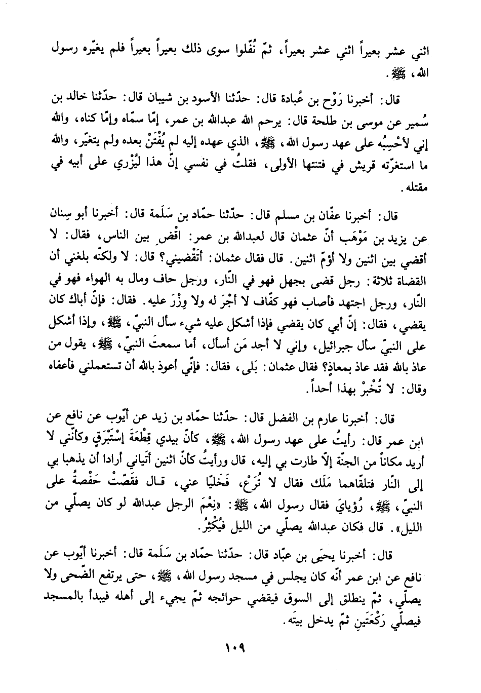 قَالَ: أَخْبَرَنَا يَحْيَى بْنُ عَبَّادٍ قَالَ: حَدَّثَنَا حَمَّادُ بْنُ سَلَمَةَ قَالَ: أَخْبَرَنَا أَيُّوبُ عَنْ نَافِعٍ عَنِ ابْنِ عُمَرَ أَنَّهُ كَانَ يَجْلِسُ فِي مَسْجِدِ رَسُولِ اللَّهِ - صَلَّى اللَّهُ عَلَيْهِ وَسَلَّمَ - حَتَّى يَرْتَفِعَ الضُّحَى وَلا يُصَلِّي. ثُمَّ يَنْطَلِقُ إِلَى السُّوقِ فَيَقْضِي حَوَائِجَهُ ثُمَّ يَجِيءُ إِلَى أَهْلِهِ فَيَبْدَأُ بِالْمَسْجِدِ فيصلي ركعتين ثم يدخل بيته.