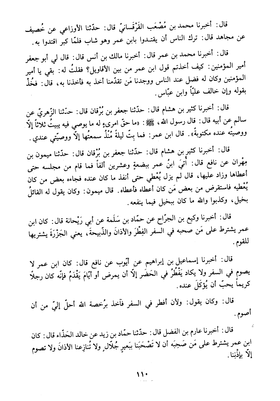 قَالَ: أَخْبَرَنَا عَارِمُ بْنُ الْفَضْلِ قَالَ: حَدَّثَنَا حَمَّادُ بْنُ زَيْدٍ عَنْ خَالِدٍ الْحَذَّاءِ قَالَ: كان ابن عمر يشترط على من صحبه أَنْ لا تَصْحَبَنَا بِبَعِيرٍ جُلالٍ وَلا تُنَازِعَنَا الأذان ولا تصوم إلا بإذننا.