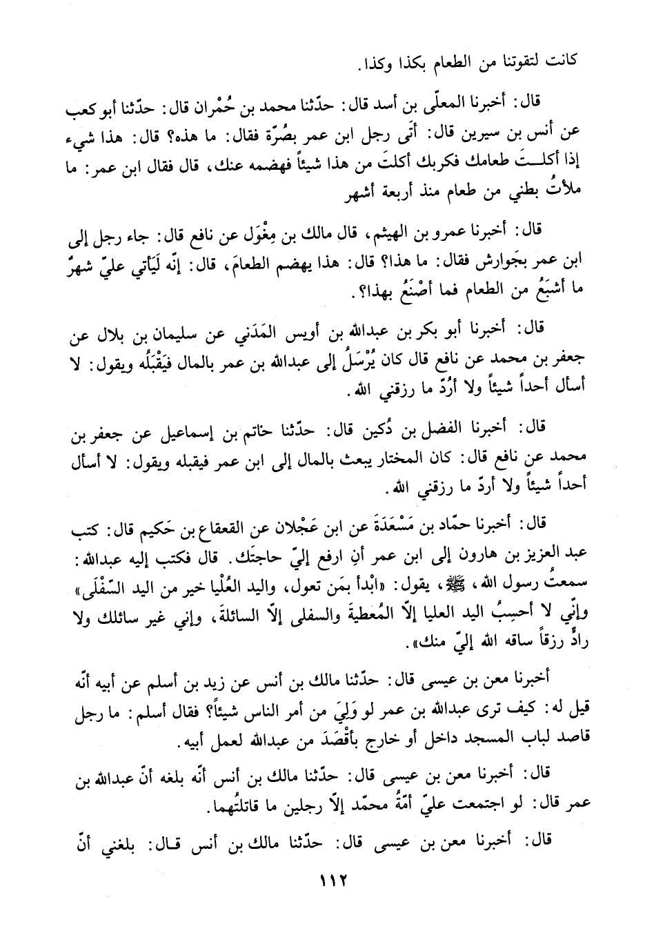 قَالَ: أَخْبَرَنَا أَبُو بَكْرِ بْنُ عَبْدِ اللَّهِ بْنِ أُوَيْسٍ الْمَدَنِيُّ عَنْ سُلَيْمَانَ بْنِ بِلالٍ عَنْ جَعْفَرِ بْنِ مُحَمَّدٍ عَنْ نَافِعٍ قَالَ كَانَ يُرْسِلُ إِلَى عَبْدِ اللَّهِ بْنِ عُمَرَ بِالْمَالِ فَيَقْبَلُهُ وَيَقُولُ: لا أَسْأَلُ أَحَدًا شَيْئًا ولا أرد ما رزقني الله.