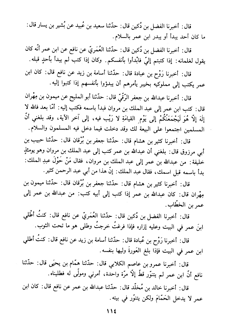 قَالَ: أَخْبَرَنَا رَوْحُ بْنُ عُبَادَةَ قَالَ: حَدَّثَنَا أُسَامَةُ بْنُ زَيْدٍ عَنْ نَافِعٍ قَالَ: كَانَ ابْنُ عُمَرَ يَكْتُبُ إِلَى مَمْلُوكِيهِ بِخَيْبَرَ يَأْمُرُهُمْ أن يبدءوا بأنفسهم إذا كتبوا إليه.