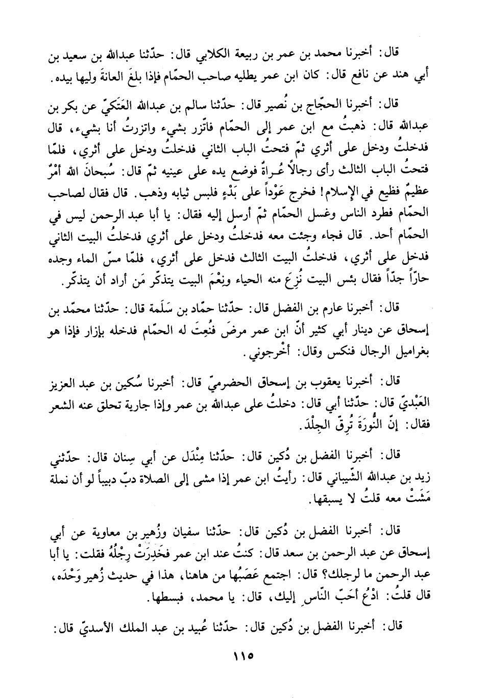 قَالَ: أَخْبَرَنَا الْحَجَّاجُ بْنُ نُصَيْرٍ قَالَ: حَدَّثَنَا سَالِمُ بْنُ عَبْدِ اللَّهِ الْعَتَكِيُّ عَنْ بَكْرِ بْنِ عَبْدِ اللَّهِ قَالَ: ذَهَبْتُ مَعَ ابْنِ عُمَرَ إِلَى الْحَمَّامِ فَاتَّزَرَ بِشَيْءٍ وَاتَّزَرْتُ أَنَا بِشَيْءٍ. قَالَ فَدَخَلْتُ وَدَخَلَ عَلَى أَثَرِي ثُمَّ فَتَحْتُ الْبَابَ الثَّانِي فَدَخَلْتُ وَدَخَلَ عَلَى أَثَرِي. فَلَمَّا فَتَحْتُ الْبَابَ الثَّالِثَ رَأَى رِجَالا عُرَاةً فَوَضَعَ يَدَهُ عَلَى عَيْنَيْهِ ثُمَّ قَالَ: سُبْحَانَ اللَّهِ أَمْرٌ عَظِيمٌ فَظِيعٌ فِي الإِسْلامِ! فَخَرَجَ عَوْدًا عَلَى بَدْءٍ فَلَبِسَ ثِيَابَهُ وَذَهَبَ. قَالَ فَقَالَ لِصَاحِبِ الْحَمَّامِ فَطَرَدَ النَّاسَ وَغَسَلَ الْحَمَّامَ ثُمَّ أَرْسَلَ إِلَيْهِ فَقَالَ: يَا أَبَا عَبْدِ الرَّحْمَنِ لَيْسَ فِي الْحَمَّامِ أَحَدٌ. قَالَ فَجَاءَ وَجِئْتُ مَعَهُ فَدَخَلْتُ وَدَخَلَ عَلَى أَثَرِي فَدَخَلْتُ الْبَيْتَ الثَّانِي فَدَخَلَ عَلَى أَثَرِي. فَدَخَلْتُ الْبَيْتَ الثَّالِثَ فدخل على أثري. فلما مس الماء وَجَدَهُ حَارًّا جِدًّا فَقَالَ بِئْسَ الْبَيْتُ نُزِعَ مِنْهُ الْحَيَاءُ وَنِعْمَ الْبَيْتُ يَتَذَكَّرُ مَنْ أَرَادَ أن يتذكر.