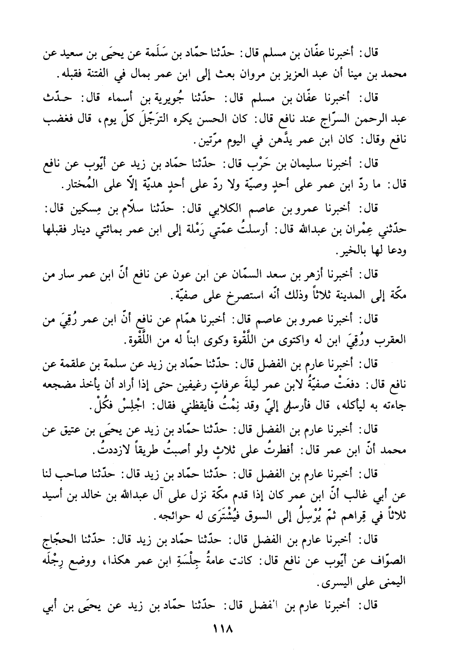 قَالَ: أَخْبَرَنَا عَفَّانُ بْنُ مُسْلِمٍ قَالَ: حَدَّثَنَا جُوَيْرِيَةُ بْنُ أَسْمَاءَ قَالَ: حَدَّثَ عَبْدُ الرَّحْمَنِ السَّرَّاجُ عِنْدَ نَافِعٍ قَالَ: كَانَ الْحَسَنُ يَكْرَهُ التَّرَجُّلَ كُلَّ يَوْمٍ. قَالَ فَغَضِبَ نَافِعٌ وَقَالَ: كَانَ ابْنُ عُمَرَ يَدْهُنُ في اليوم مرتين.