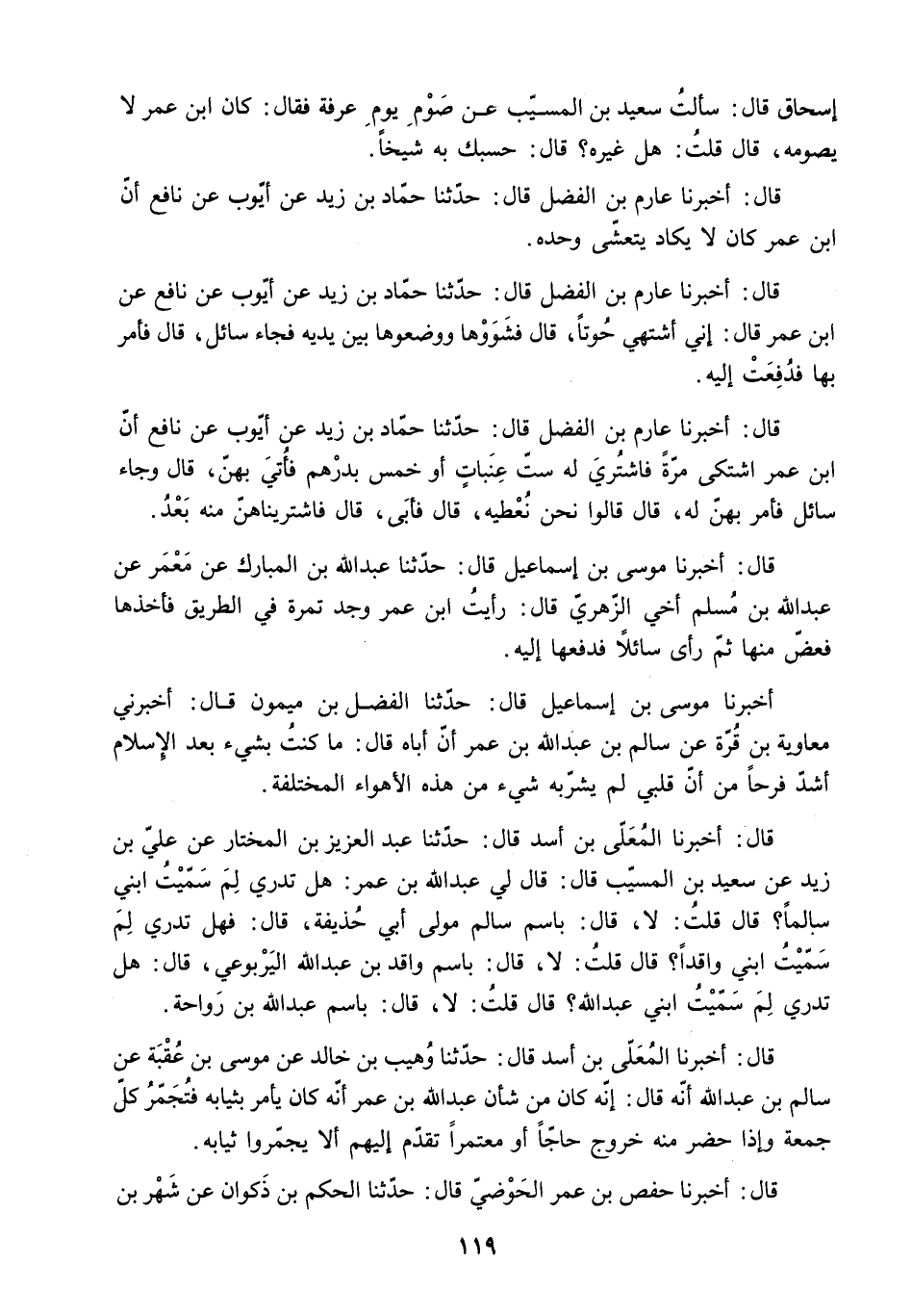 إِسْحَاقَ قَالَ: سَأَلْتُ سَعِيدَ بْنَ الْمُسَيِّبِ عَنْ صَوْمِ يَوْمِ عَرَفَةَ فَقَالَ: كَانَ ابْنُ عُمَرَ لا يَصُومُهُ. قَالَ قُلْتُ: هَلْ غَيْرُهُ؟ قَالَ: حسبك به شيخا.