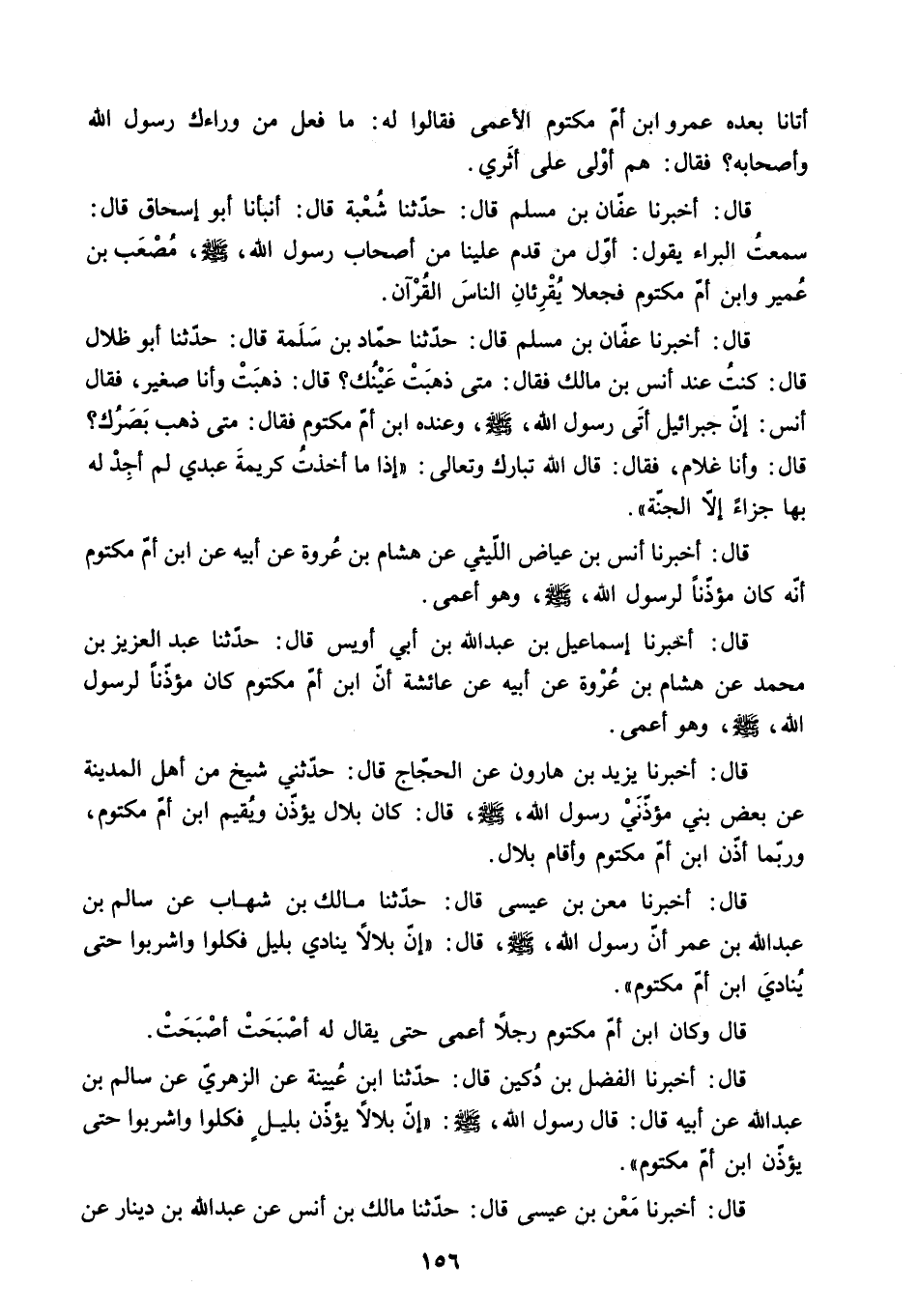 قال: أَخْبَرَنَا أَنَسُ بْنُ عِيَاضٍ اللَّيْثِيُّ عَنْ هِشَامِ بْنِ عُرْوَةَ عَنْ أَبِيهِ عَنْ ابن أُمِّ مَكْتُومٍ أَنَّهُ كَانَ مُؤَذِّنًا لِرَسُولِ اللَّهِ - صلى الله عليه وسلم - وهو أعمى.