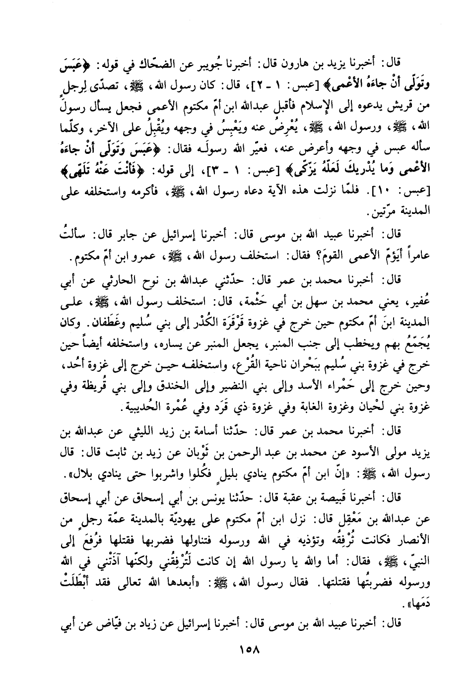 قَالَ: أَخْبَرَنَا يَزِيدُ بْنُ هَارُونَ قَالَ: أَخْبَرَنَا جُوَيْبِرٌ عَنِ الضَّحَّاكِ فِي قَوْلِهِ: «عَبَسَ وَتَوَلَّى أَنْ جاءَهُ الْأَعْمى» عبس: 1- 2. قَالَ: كَانَ رَسُولُ اللَّهِ - صَلَّى اللَّهُ عَلَيْهِ وَسَلَّمَ - تَصَدَّى لِرَجُلٍ مِنْ قُرَيْشٍ يَدْعُوهُ إِلَى الإِسْلامِ فَأَقْبَلَ عَبْدُ الله ابن أُمِّ مَكْتُومٍ الأَعْمَى فَجَعَلَ يَسْأَلُ رَسُولَ اللَّهِ - صَلَّى اللَّهُ عَلَيْهِ وَسَلَّمَ - وَرَسُولُ اللَّهِ - صَلَّى اللَّهُ عَلَيْهِ وَسَلَّمَ - يَعْرِضُ عَنْهُ وَيَعْبَسُ فِي وَجْهِهِ وَيُقْبِلُ عَلَى الآخَرِ. وَكُلَّمَا سَأَلَهُ عَبَسَ فِي وَجْهِهِ وَأَعْرَضَ عَنْهُ. فَعَيَّرَ اللَّهُ رَسُولَهُ فَقَالَ: «عَبَسَ وَتَوَلَّى أَنْ جاءَهُ الْأَعْمى وَما يُدْرِيكَ لَعَلَّهُ يَزَّكَّى» عبس: 1- 3. إِلَى قَوْلِهِ: «فَأَنْتَ عَنْهُ تَلَهَّى» عبس: 10. فَلَمَّا نَزَلَتْ هَذِهِ الآيَةُ دَعَاهُ رَسُولُ اللَّهِ - صَلَّى اللَّهُ عَلَيْهِ وَسَلَّمَ - فَأَكْرَمَهُ وَاسْتَخْلَفَهُ عَلَى المدينة مرتين.