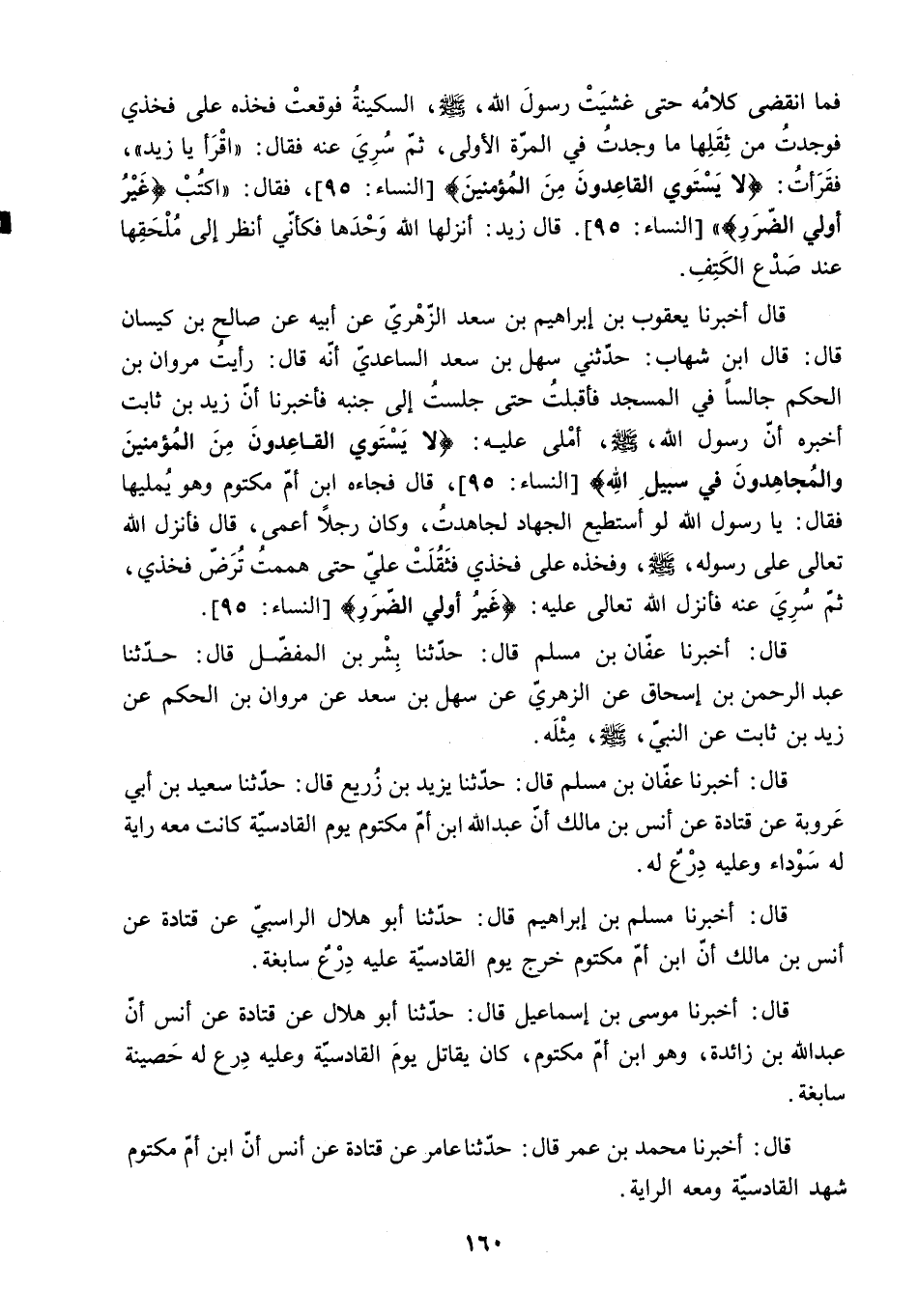 فَقَرَأْتُ: «لا يَسْتَوِي الْقاعِدُونَ مِنَ الْمُؤْمِنِينَ» النساء: 95. فَقَالَ: اكْتُبْ «غَيْرُ أُولِي الضَّرَرِ» النساء: 95. قَالَ زَيْدٌ: أَنْزَلَهَا اللَّهُ وَحْدَهَا فَكَأَنِّي أَنْظُرُ إِلَى مُلْحَقِهَا عِنْدَ صَدْعِ الْكَتِفِ.] قَالَ أَخْبَرَنَا يَعْقُوبُ بْنُ إِبْرَاهِيمَ بْنِ سَعْدٍ الزُّهْرِيُّ عَنْ أَبِيهِ عَنْ صَالِحِ بْنِ كَيْسَانَ قَالَ: قَالَ ابْنُ شِهَابٍ: حَدَّثَنِي سَهْلُ بْنُ سَعْدٍ السَّاعِدِيُّ أَنَّهُ قَالَ: رَأَيْتُ مَرْوَانَ بْنَ الْحَكَمِ جَالِسًا فِي الْمَسْجِدِ فَأَقْبَلْتُ حَتَّى جَلَسْتُ إِلَى جَنْبِهِ فَأَخْبَرَنَا أَنَّ زَيْدَ بْنَ ثَابِتٍ أَخْبَرَهُ أَنَّ رَسُولَ اللَّهِ - صَلَّى اللَّهُ عَلَيْهِ وَسَلَّمَ - أَمْلَى عَلَيْهِ: «لا يَسْتَوِي الْقاعِدُونَ مِنَ الْمُؤْمِنِينَ وَالْمُجاهِدُونَ فِي سَبِيلِ اللَّهِ» النساء: 95. قَالَ فَجَاءَهُ ابْنُ أُمِّ مَكْتُومٍ وَهُوَ يُمْلِيهَا فَقَالَ: يَا رَسُولَ اللَّهِ لَوْ أَسْتَطِيعُ الْجِهَادَ لَجَاهَدْتُ. وَكَانَ رَجُلا أَعْمَى. قَالَ فَأَنْزَلَ اللَّهُ تَعَالَى عَلَى رَسُولِهِ - صَلَّى اللَّهُ عَلَيْهِ وَسَلَّمَ - وفخذه على فخذي فثقلت علي حَتَّى هَمَمْتُ تُرَضَّ فَخِذِي.