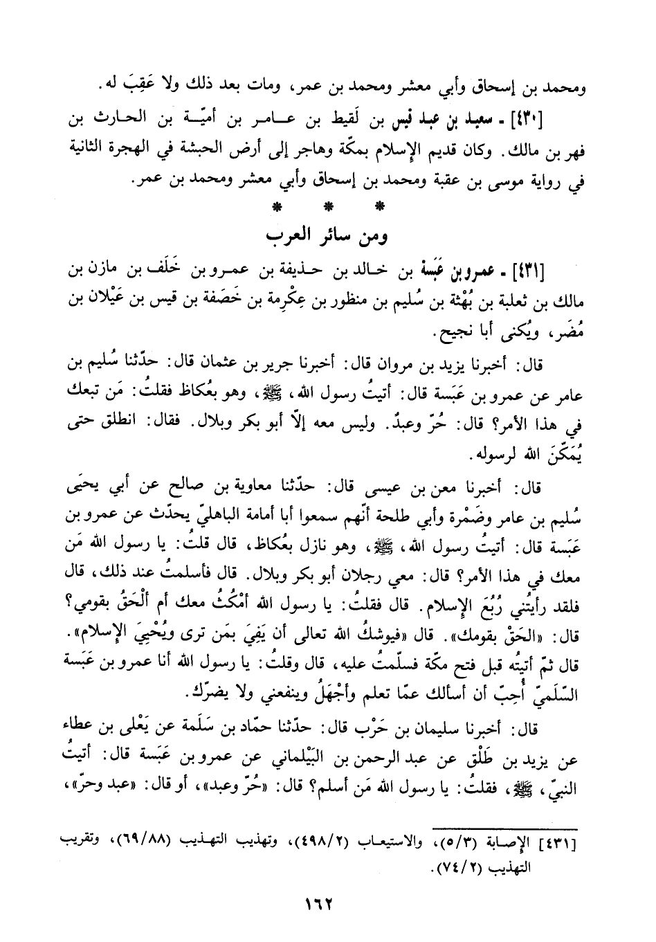 431 الإصابة (3/ 5) ، والاستيعاب (2/ 498) ، وتهذيب التهذيب (88/ 69) ، وتقريب التهذيب (2/ 74) .
