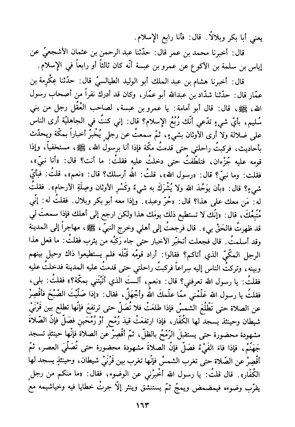 قَالَ: أَخْبَرَنَا هِشَامُ بْنُ عَبْدِ الْمَلِكِ أَبُو الْوَلِيدِ الطَّيَالِسِيُّ قَالَ: حَدَّثَنَا عِكْرِمَةُ بْنُ عَمَّارٍ قَالَ: حَدَّثَنَا شَدَّادُ بْنُ عَبْدِ اللَّهِ أَبُو عَمَّارٍ. وَكَانَ قَدْ أَدْرَكَ نَفَرًا مِنْ أَصْحَابِ رَسُولِ اللَّهِ - صَلَّى اللَّهُ عَلَيْهِ وسلم - قال: قَالَ أَبُو أُمَامَةَ: يَا عَمْرُو بْنَ عَبَسَةَ. لِصَاحِبِ الْعُقُلِ رَجُلٌ مِنْ بَنِي سُلَيْمٍ. بِأَيِّ شَيْءٍ تَدَّعِي أَنَّكَ رُبُعُ الإِسْلامِ؟ قَالَ: إِنِّي كُنْتُ فِي الْجَاهِلِيَّةِ أَرَى النَّاسَ عَلَى ضَلالَةٍ وَلا أَرَى الأَوْثَانَ بِشَيْءٍ. ثُمَّ سَمِعْتُ عَنَ رَجُلٍ يُخْبِرُ أَخْبَارًا بِمَكَّةَ وَيُحَدِّثُ بِأَحَادِيثَ. فَرَكِبْتُ رَاحِلَتِي حَتَّى قَدِمْتُ مَكَّةَ فَإِذَا أَنَا بِرَسُولِ اللَّهِ - صَلَّى اللَّهُ عَلَيْهِ وَسَلَّمَ - مُسْتَخْفِيًا. وَإِذَا قَوْمُهُ عَلَيْهِ جُزْءَانِ. فَتَلَطَّفْتُ حَتَّى دَخَلْتُ عَلَيْهِ فَقُلْتُ: [مَا أَنْتَ؟ قَالَ: أَنَا نَبِيُّ.