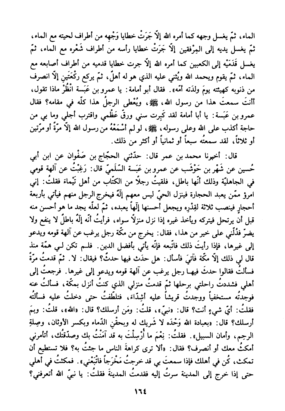 قَالَ: أَخْبَرَنَا مُحَمَّدُ بْنُ عُمَرَ قَالَ: حَدَّثَنِي الْحَجَّاجُ بْنُ صَفْوَانَ عَنِ ابْنِ أَبِي حُسَيْنٍ عَنْ شَهْرِ بْنِ حَوْشَبٍ عَنْ عَمْرِو بْنِ عَبَسَةَ السُّلَمِيِّ قَالَ: رَغِبْتُ عَنْ آلِهَةِ قَوْمِي فِي الْجَاهِلِيَّةِ وَذَلِكَ أَنَّهَا بَاطِلٌ. فَلَقِيتُ رَجُلا مِنَ الْكُتَّابِ مِنْ أَهْلِ تَيْمَاءَ فَقُلْتُ: إِنِّي امْرُؤٌ مِمَّنْ يَعْبُدُ الْحِجَارَةَ فَيَنْزِلُ الْحَيُّ لَيْسَ معهم إله فيخرج الرَّجُلُ مِنْهُمْ فَيَأْتِي بِأَرْبَعَةِ أَحْجَارٍ فَيَنْصِبُ ثَلاثَةً لِقِدْرِهِ وَيَجْعَلُ أَحْسَنَهَا إِلَهًا يَعْبُدُهُ. ثُمَّ لَعَلَّهُ يَجِدُ مَا هُوَ أَحْسَنُ مِنْهُ قَبْلَ أَنْ يَرْتَحِلَ فَيَتْرُكُهُ وَيَأْخُذُ غَيْرَهُ إِذَا نَزَلَ مَنْزِلا سِوَاهُ. فَرَأَيْتُ أَنَّهُ إِلَهٌ بَاطِلٌ لا يَنْفَعُ وَلا يَضُرُّ فَدُلَّنِي عَلَى خَيْرٍ مِنْ هَذَا. فَقَالَ: يَخْرُجُ مِنْ مَكَّةَ رَجُلٌ يَرْغَبُ عَنْ آلِهَةِ قَوْمِهِ وَيَدْعُو إِلَى غَيْرَهَا. فَإِذَا رَأَيْتَ ذَلِكَ فَاتَّبِعْهُ فَإِنَّهُ يَأْتِي بِأَفْضَلِ الدِّينِ. فَلَمْ تكن لي همة منذ قال لي ذَلِكَ إِلا مَكَّةَ فَآتِي فَأَسْأَلُ: هَلْ حَدَثَ فِيهَا حَدَثٌ؟ فَيُقَالُ: لا. ثُمَّ قَدِمْتُ مَرَّةً فَسَأَلْتُ فَقَالُوا حَدَثَ فِيهَا رَجُلٌ يَرْغَبُ عَنْ آلِهَةِ قَوْمِهِ وَيَدْعُو إِلَى غَيْرِهَا. فَرَجَعْتُ إِلَى أَهْلِي فَشَدَدْتُ رَاحِلَتِي بِرَحْلِهَا ثُمَّ قَدِمْتُ مَنْزِلِي الَّذِي كُنْتُ أَنْزَلَ بِمَكَّةَ. فَسَأَلْتُ عَنْهُ فَوَجَدْتُهُ مُسْتَخْفِيًا وَوَجَدْتُ قُرَيْشًا عَلَيْهِ أَشِدَّاءَ. فَتَلَطَّفْتُ حَتَّى دَخَلْتُ عَلَيْهِ فَسَأَلْتُهُ [فَقُلْتُ: أَيُّ شَيْءٍ أَنْتَ؟ قَالَ: نَبِيُّ. قُلْتُ: وَمَنْ أَرْسَلَكَ؟ قَالَ: اللَّهُ. قُلْتُ: وَبِمَ أَرْسَلَكَ؟ قَالَ: بِعِبَادَةِ اللَّهِ وَحْدَهُ لا شَرِيكَ لَهُ وَبِحَقْنِ الدِّمَاءِ وَبِكَسْرِ الأَوْثَانِ. وَصِلَةِ الرَّحِمِ. وَأَمَانِ السَّبِيلِ. فَقُلْتُ: نَعَمْ مَا أُرْسِلْتَ بِهِ قَدْ آمَنْتُ بِكَ وَصَدَّقْتُكَ. أَتَأْمُرُنِي أَمْكُثُ مَعَكَ أَوْ أَنْصَرِفُ؟ فَقَالَ: أَلا تَرَى كَرَاهَةَ النَّاسِ مَا جِئْتُ بِهِ؟ فَلا تَسْتَطِيعَ أَنْ تَمْكُثَ. كُنْ فِي أَهْلِكَ فَإِذَا سَمِعْتَ بِي قَدْ خَرَجْتُ مَخْرَجًا فَاتَّبِعْنِي. فَمَكَثْتُ فِي أَهْلِي حَتَّى إِذَا خَرَجَ إِلَى الْمَدِينَةِ سِرْتُ إِلَيْهِ فَقَدِمْتُ الْمَدِينَةَ فَقُلْتُ: يَا نَبِيَّ اللَّهِ أتعرفني؟