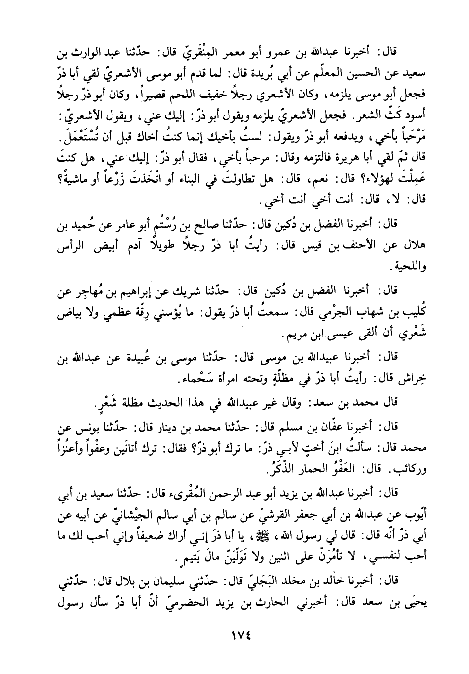 قَالَ: أَخْبَرَنَا عَبْدُ اللَّهِ بْنُ عَمْرٍو أَبُو مَعْمَرٍ الْمِنْقَرِيُّ قَالَ: حَدَّثَنَا عَبْدُ الْوَارِثِ بْنُ سَعِيدٍ عن الحسين المعلم عن أبي بريدة قَالَ: لَمَّا قَدِمَ أَبُو مُوسَى الأَشْعَرِيُّ لَقِيَ أَبَا ذَرٍّ فَجَعَلَ أَبُو مُوسَى يَلْزَمُهُ. وَكَانَ الأَشْعَرِيُّ رَجُلا خَفِيفَ اللَّحْمِ قَصِيرًا. وَكَانَ أَبُو ذَرٍّ رَجُلا أَسْوَدَ كَثَّ الشَّعْرِ. فَجَعَلَ الأَشْعَرِيُّ يَلْزَمُهُ وَيَقُولُ أَبُو ذَرٍّ: إِلَيْكَ عَنِّي. وَيَقُولُ الأَشْعَرِيُّ: