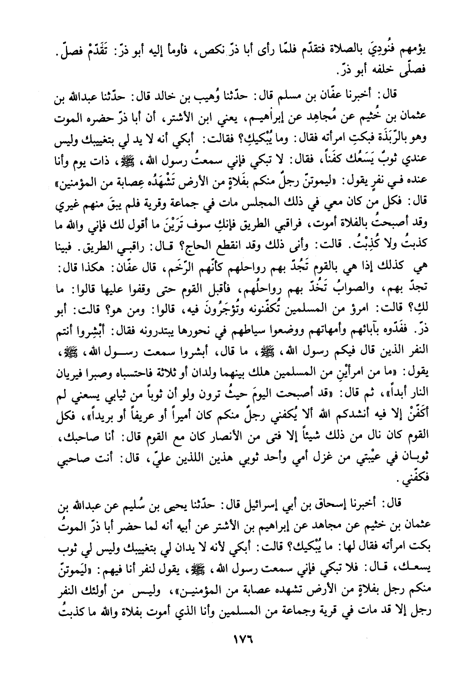 قَالَ: أَخْبَرَنَا عَفَّانُ بْنُ مُسْلِمٍ قَالَ: حَدَّثَنَا وُهَيْبُ بْنُ خَالِدٍ قَالَ: حَدَّثَنَا عَبْدُ اللَّهِ بْنِ عُثْمَانَ بْنِ خُثَيْمٍ عَنْ مُجَاهِدٍ عَنْ إِبْرَاهِيمَ. يَعْنِي ابْنَ الأَشْتَرِ. أَنَّ أَبَا ذَرٍّ حَضَرَهُ الْمَوْتُ وَهُوَ بِالرَّبَذَةِ فَبَكَتِ امْرَأَتُهُ فَقَالَ: وَمَا يُبْكِيكَ؟ فَقَالَتْ: أَبْكِي أَنَّهُ لا يَدَ لِي بِتَغْيِيبِكَ وَلَيْسَ عِنْدِي ثَوْبٌ يَسَعُكَ كَفَنًا. فَقَالَ: لا تَبْكِي فَإِنِّي سَمِعْتُ رَسُولَ اللَّهِ - صَلَّى اللَّهُ عَلَيْهِ وَسَلَّمَ - ذَاتَ يَوْمٍ وَأَنَا عِنْدَهُ فِي نَفَرٍ يَقُولُ: لَيَمُوتَنَّ رَجُلٌ مِنْكُمْ بِفَلاةٍ مِنَ الأَرْضِ تَشْهَدُهُ عِصَابَةٌ مِنَ الْمُؤْمِنِينَ قَالَ: فَكُلُّ مَنْ كَانَ مَعِي فِي ذَلِكَ الْمَجْلِسِ مَاتَ فِي جَمَاعَةٍ وَقَرْيَةٍ فَلَمْ يَبْقَ مِنْهُمْ غَيْرِي وَقَدْ أَصْبَحْتُ بِالْفَلاةِ أَمُوتُ. فَرَاقِبِي الطَّرِيقَ فَإِنَّكِ سَوْفَ تَرَيْنَ مَا أَقُولُ لَكَ فَإِنِّي وَاللَّهِ مَا كَذَبْتُ وَلا كُذِبْتُ. قَالَتْ: وَأَنَّى ذَلِكَ وَقَدِ انْقَطَعَ الْحَاجُّ؟ قَالَ: رَاقِبِي الطَّرِيقَ. فَبَيْنَا هِيَ كَذَلِكَ إِذَا هِيَ بِالْقَوْمِ تَجِدِّ بِهِمْ رَوَاحِلُهُمْ كَأَنَّهُمُ الرَّخَمُ. قَالَ عَفَّانُ: هَكَذَا قَالَ: