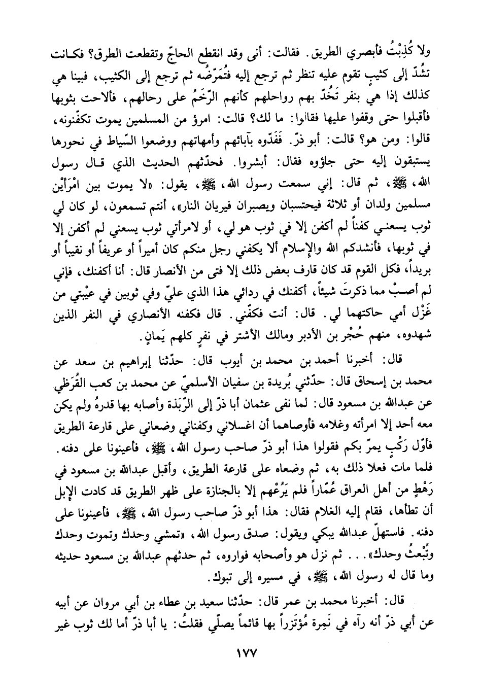 فَلَمَّا مَاتَ فَعَلا ذَلِكَ بِهِ. ثُمَّ وَضَعَاهُ عَلَى قَارِعَةِ الطَّرِيقِ. وَأَقْبَلَ عَبْدُ اللَّهِ بْنُ مَسْعُودٍ فِي رَهْطٍ مِنْ أَهْلِ الْعِرَاقِ عُمَّارًا فَلَمْ يَرُعْهُمْ إِلا بِالْجَنَازَةِ عَلَى ظَهْرِ الطَّرِيقِ قَدْ كَادَتِ الإبل أن تَطَأُهَا. فَقَامَ إِلَيْهِ الْغُلامُ فَقَالَ: هَذَا أَبُو ذَرٍّ صَاحِبُ رَسُولِ اللَّهِ - صَلَّى اللَّهُ عَلَيْهِ وَسَلَّمَ - فَأَعِينُونَا عَلَى دَفْنِهِ. [فَاسْتَهَلَّ عَبْدُ اللَّهِ يَبْكِي وَيَقُولُ: صَدَقَ رَسُولُ اللَّهِ. تَمْشِي وَحْدَكَ وَتَمُوتُ وَحْدَكَ وَتُبْعَثُ وَحْدَكَ] ... ثُمَّ نَزَلَ هُوَ وَأَصْحَابُهُ فَوَارَوْهُ. ثُمَّ حَدَّثَهُمْ عَبْدُ اللَّهِ بْنُ مسعود حديثه وَمَا قَالَ لَهُ رَسُولُ اللَّهِ - صَلَّى اللَّهُ عَلَيْهِ وسلم - في مسيره إلى تبوك.
