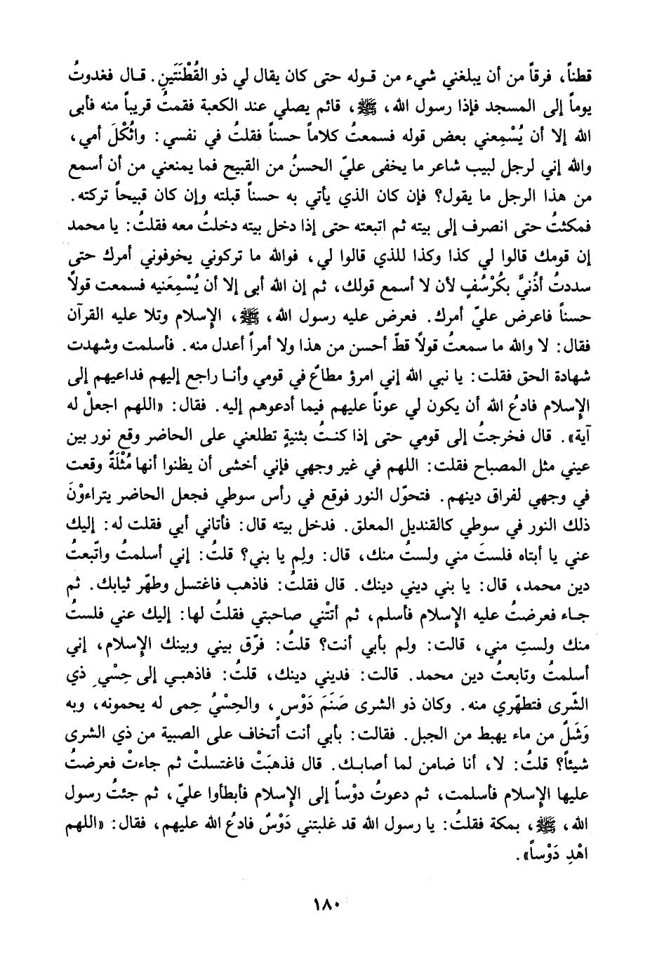 فَمَكَثْتُ حَتَّى انْصَرَفَ إِلَى بَيْتِهِ ثُمَّ اتَّبَعْتُهُ حَتَّى إِذَا دَخَلَ بَيْتَهُ دَخَلْتُ مَعَهُ فَقُلْتُ: يَا مُحَمَّدُ إِنَّ قَوْمَكَ قَالُوا لِي كَذَا وَكَذَا لِلَّذِي قالوا لي. فو الله مَا تَرَكُونِي يُخَوِّفُونِي أَمْرَكَ حَتَّى سَدَدْتُ أُذُنِي بِكُرْسُفٍ لأَنْ لا أَسْمَعَ قَوْلَكَ. ثُمَّ إِنَّ اللَّهَ أَبَى إِلا أَنْ يُسْمِعَنِيهِ فَسَمِعْتُ قَوْلا حَسَنًا فَاعْرِضْ عَلَيَّ أَمْرَكَ. فَعَرَضَ عَلَيْهِ رَسُولُ اللَّهِ - صَلَّى اللَّهُ عَلَيْهِ وَسَلَّمَ - الإِسْلامَ وَتَلا عَلَيْهِ الْقُرْآنَ فَقَالَ: لا وَاللَّهُ مَا سَمِعْتُ قَوْلا قَطُّ أَحْسَنَ مِنْ هَذَا وَلا أَمْرًا أَعْدَلَ مِنْهُ. فَأَسْلَمْتُ وَشَهِدْتُ شَهَادَةَ الْحَقِّ فَقُلْتُ: يَا نَبِيَّ اللَّهِ إِنِّي امْرُؤٌ مُطَاعٌ فِي قومي وأنا راجع إليهم فداعيهم إِلَى الإِسْلامِ فَادْعُ اللَّهَ أَنْ يَكُونَ لِي عَوْنًا عَلَيْهِمْ فِيمَا أَدْعُوهُمْ إِلَيْهِ. [فَقَالَ: اللَّهُمَّ اجْعَلْ لَهُ أَيَّةً] . قَالَ فَخَرَجْتُ إِلَى قَوْمِي حَتَّى إِذَا كُنْتُ بِثَنِيَّةِ تُطْلِعُنِي عَلَى الْحَاضِرِ وَقَعَ نُورٌ بَيْنَ عَيْنِي مِثْلُ الْمِصْبَاحِ فَقُلْتُ: اللَّهُمَّ فِي غَيْرِ وَجْهِي فَإِنِّي أَخْشَى أَنْ يَظُنُّوا أَنَّهَا مُثْلَةٌ وَقَعَتْ فِي وَجْهِي لِفِرَاقِ دِينِهِمْ. فَتَحَوَّلَ النُّورُ فَوَقَعَ فِي رَأْسِ سَوْطِي فَجَعَلَ الْحَاضِرُ يَتَرَاءَوْنَ ذَلِكَ النُّورَ فِي سَوْطِي كَالْقِنْدِيلِ الْمُعَلَّقِ. فَدَخَلَ بَيْتَهُ قَالَ: فَأَتَانِي أَبِي فَقُلْتُ لَهُ: إِلَيْكَ عَنِّي يَا أَبَتَاهُ فَلَسْتَ مِنِّي وَلَسْتُ مِنْكَ. قَالَ: وَلِمَ يَا بُنَيَّ؟ قُلْتُ: إِنِّي أَسْلَمْتُ وَاتَّبَعْتُ دِينَ مُحَمَّدٍ. قَالَ: يَا بُنَيَّ دِينِي دِينُكَ. قَالَ فَقُلْتُ: فَاذْهَبْ فَاغْتَسِلْ وَطَهِّرْ ثِيَابَكَ. ثُمَّ جَاءَ فَعَرَضْتُ عَلَيْهِ الإِسْلامَ فَأَسْلَمَ. ثُمَّ أَتَتْنِي صَاحِبَتِي فَقُلْتُ لَهَا: إِلَيْكِ عَنِّي فَلَسْتُ مِنْكَ وَلَسْتِ مِنِّي. قَالَتْ: وَلِمَ بِأَبِي أَنْتَ؟ قُلْتُ: فَرَّقَ بَيْنِي وَبَيْنَكِ الإِسْلامُ. إِنِّي أَسْلَمْتُ وَتَابَعْتُ دِينَ مُحَمَّدٍ. قَالَتْ: فَدِينِي دِينُكَ. قُلْتُ: فَاذْهَبِي إِلَى حِسْيِ ذِي الشِّرَى فَتَطَهَّرِي مِنْهُ. وَكَانَ ذُو الشِّرَى صَنَمَ دَوْسٍ. وَالْحِسْيِ حِمَى لَهُ يُحَمُّونَهُ. وَبِهِ وَشَلٌ مِنْ مَاءٍ يَهْبِطُ مِنَ الْجَبَلِ. فَقَالَتْ: بِأَبِي أَنْتَ أَتَخَافُ عَلَى الصِّبْيَةِ مِنْ ذِي الشِّرَى شَيْئًا؟ قُلْتُ: لا. أَنَا ضَامِنٌ لِمَا أَصَابَكِ. قَالَ فَذَهَبَتْ فَاغْتَسَلَتْ ثُمَّ جَاءَتْ فَعَرَضْتُ عَلَيْهَا الإِسْلامَ فَأَسْلَمَتْ. ثُمَّ دَعَوْتُ دَوْسًا إِلَى الإِسْلامِ فأبطأوا عَلَيَّ. ثُمَّ جِئْتُ رَسُولَ اللَّهِ - صَلَّى اللَّهُ عَلَيْهِ وَسَلَّمَ - بِمَكَّةَ فَقُلْتُ: يَا رَسُولَ اللَّهِ قَدْ غَلَبَتْنِي دَوْسٌ فَادْعُ اللَّهَ عَلَيْهِمْ. فَقَالَ: [اللهم اهد دوسا] .