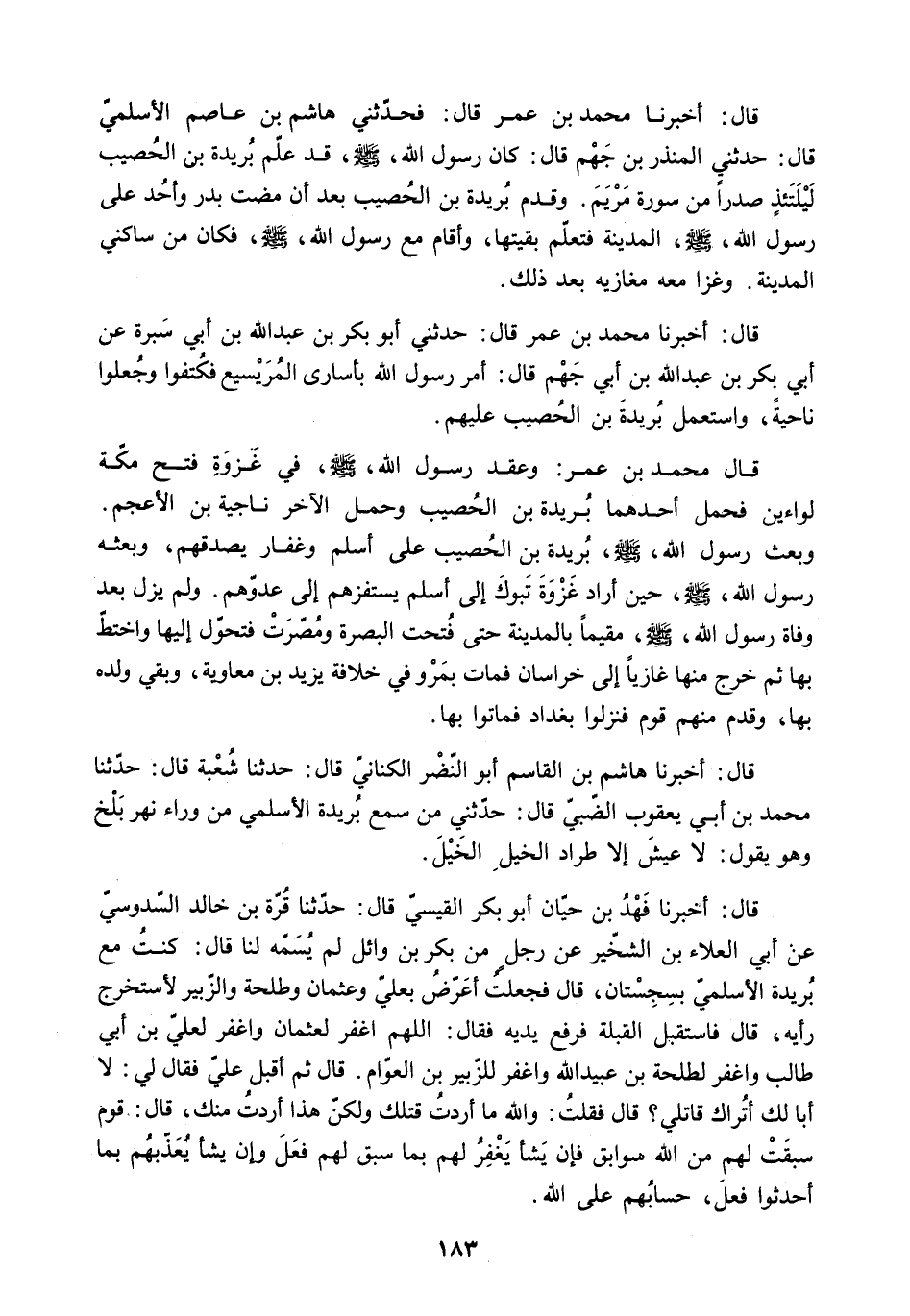 قال: أَخْبَرَنَا فَهِدُ بْنُ حَيَّانَ أَبُو بَكْرٍ الْقَيْسِيُّ قَالَ: حَدَّثَنَا قُرَّةُ بْنُ خَالِدٍ السَّدُوسِيُّ عَنْ أبي العلاء بْنِ الشِّخِّيرِ عَنْ رَجُلٍ مِنْ بَكْرِ بْنِ وَائِلٍ لَمْ يُسَمِّهِ لَنَا قَالَ: كُنْتُ مَعَ بُرَيْدَةَ الأَسْلَمِيِّ بِسِجِسْتَانَ. قَالَ فَجَعَلْتُ أُعَرِّضُ بِعَلِيٍّ وَعُثْمَانَ وَطَلْحَةَ وَالزُّبَيْرِ لأَسْتَخْرِجَ رَأْيَهُ. قَالَ فَاسْتَقْبَلَ الْقِبْلَةَ فَرَفَعَ يَدَيْهِ فَقَالَ: اللَّهُمَّ اغْفِرْ لِعُثْمَانَ وَاغْفِرْ لِعَلِيِّ بْنِ أَبِي طَالِبٍ وَاغْفِرْ لِطَلْحَةَ بْنِ عُبَيْدِ اللَّهِ وَاغْفِرْ لِلزُّبَيْرِ بْنِ الْعَوَّامِ. قَالَ ثُمَّ أَقْبَلَ عَلَيَّ فَقَالَ لِي: لا أَبَا لَكَ أَتُرَاكَ قَاتِلِي؟ قَالَ فَقُلْتُ: وَاللَّهِ مَا أَرَدْتُ قَتْلَكَ وَلَكِنْ هَذَا أَرَدْتُ مِنْكَ. قَالَ: قَوْمٌ سَبَقَتْ لَهُمْ مِنَ اللَّهِ سَوَابِقُ فَإِنْ يَشَأْ يَغْفِرْ لَهُمْ بِمَا سَبَقَ لَهُمْ فَعَلَ وَإِنْ يَشَأْ يُعَذِّبْهُمْ بِمَا أَحْدَثُوا فَعَلَ. حسابهم على الله.