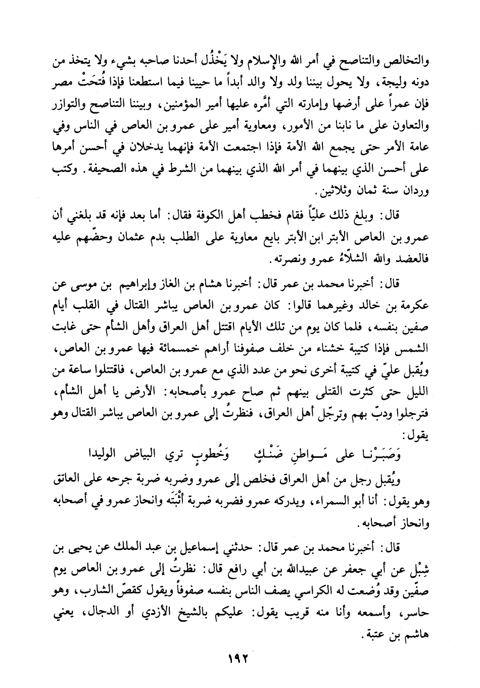 قَالَ: أَخْبَرَنَا مُحَمَّدُ بْنُ عُمَرَ قَالَ: أَخْبَرَنَا هِشَامُ بْنُ الْغَازِ وَإِبْرَاهِيمُ بْنُ مُوسَى عَنْ عِكْرِمَةَ بْنِ خَالِدٍ وَغَيْرِهِمَا قَالُوا: كَانَ عَمْرُو بْنُ الْعَاصِ يُبَاشِرُ الْقِتَالَ فِي الْقَلْبِ أَيَّامَ صِفِّينَ بِنَفْسِهِ. فَلَمَّا كَانَ يَوْمٌ مِنْ تِلْكَ الأَيَّامِ اقْتَتَلَ أَهْلُ الْعِرَاقِ وَأَهْلُ الشَّامِ حَتَّى غَابَتِ الشَّمْسُ فَإِذَا كَتِيبَةٌ خَشْنَاءُ مِنْ خَلْفِ صُفُوفِنَا أَرَاهُمْ خَمْسَمِائَةٍ فِيهَا عَمْرُو بْنُ الْعَاصِ.