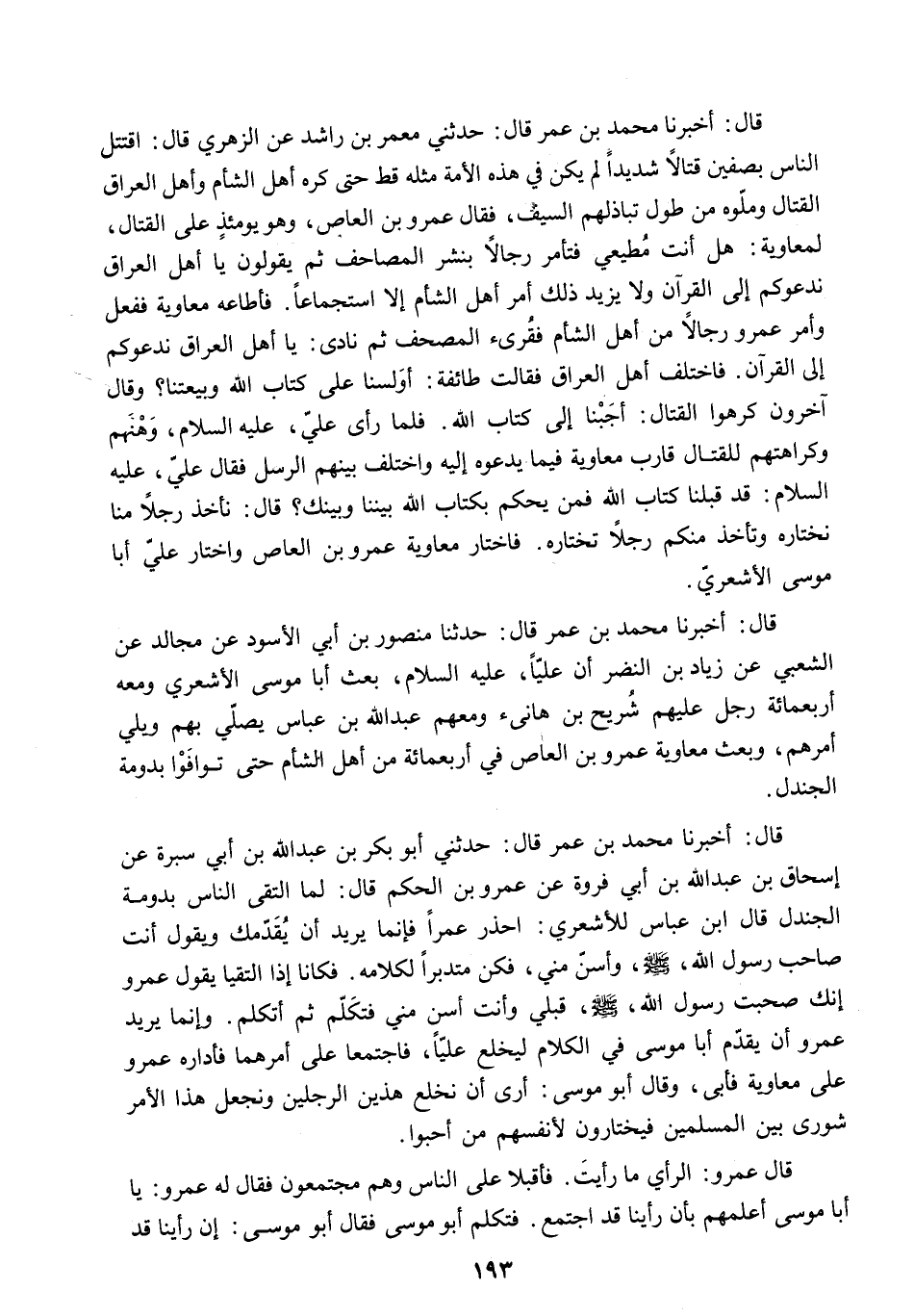 قَالَ: أَخْبَرَنَا مُحَمَّدُ بْنُ عُمَرَ قَالَ: حَدَّثَنِي مَعْمَرُ بْنُ رَاشِدٍ عَنِ الزُّهْرِيِّ قَالَ: اقْتَتَلَ النَّاسُ بِصِفِّينَ قِتَالا شَدِيدًا لَمْ يَكُنْ فِي هَذِهِ الأُمَّةِ مِثْلَهُ قَطُّ حَتَّى كَرِهَ أَهْلُ الشَّامِ وَأَهْلُ الْعِرَاقِ الْقِتَالَ وَمَلُّوهُ مِنْ طُولِ تَبَاذُلِهِمُ السَّيْفَ. فَقَالَ عَمْرُو بْنُ الْعَاصِ. وَهُوَ يَوْمَئِذٍ عَلَى الْقِتَالِ.
