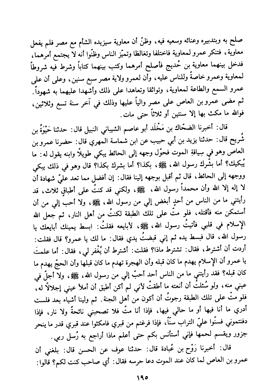 قَالَ: أَخْبَرَنَا الضَّحَّاكُ بْنُ مَخْلَدٍ أَبُو عَاصِمٍ الشَّيْبَانِيُّ النَّبِيلُ قَالَ: حَدَّثَنَا حَيْوَةُ بْنُ شُرَيْحٍ قَالَ: حَدَّثَنَا يَزِيدُ بْنُ أَبِي حَبِيبٍ عَنِ ابْنِ شِمَاسَةَ الْمَهْرِيِّ قَالَ: حَضَرْنَا عَمْرَو بْنَ الْعَاصِ وَهُوَ فِي سِيَاقَةِ الْمَوْتِ فَحَوَّلَ وَجْهَهُ إِلَى الْحَائِطِ يَبْكِي طَوِيلا وَابْنُهُ يَقُولُ لَهُ: مَا يُبْكِيكَ؟ أَمَا بَشَّرَكَ رَسُولُ اللَّهِ - صَلَّى اللَّهُ عَلَيْهِ وَسَلَّمَ - بِكَذَا؟ أَمَا بَشَّرَكَ بِكَذَا؟ قَالَ وَهُوَ فِي ذَلِكَ يَبْكِي وَوَجْهُهُ إِلَى الْحَائِطِ. قَالَ ثُمَّ أَقْبَلَ بِوَجْهِهِ إِلَيْنَا فَقَالَ: إِنَّ أَفْضَلَ مِمَّا تَعُدُّ عَلَيَّ شَهَادَةُ أَنْ لا إِلَهَ إِلا اللَّهُ وَأَنَّ مُحَمَّدًا رَسُولُ اللَّهِ - صَلَّى اللَّهُ عَلَيْهِ وَسَلَّمَ - وَلَكِنِّي قَدْ كُنْتُ عَلَى أَطْبَاقٍ ثَلاثٍ. قَدْ رَأَيْتُنِي مَا من الناس من أَحَدٌ أَبْغَضُ إِلِيَّ مِنْ رَسُولِ اللَّهِ - صَلَّى اللَّهُ عَلَيْهِ وَسَلَّمَ - وَلا أَحَبُّ إِلَيَّ مِنْ أَنْ أَسْتَمْكِنَ مِنْهُ فَأَقْتُلَهُ. فَلَوْ مِتُّ عَلَى تِلْكَ الطَّبَقَةِ لَكُنْتُ مِنْ أَهْلِ النَّارِ. ثُمَّ جَعَلَ اللَّهُ الإِسْلامَ فِي قَلْبِي فَأَتَيْتُ رَسُولَ اللَّهِ - صَلَّى اللَّهُ عَلَيْهِ وَسَلَّمَ - لأُبَايِعَهُ فَقُلْتُ: ابسط يمينك أبايعك يَا رَسُولَ اللَّهِ. قَالَ فَبَسَطَ يَدَهُ ثُمَّ إِنِّي قَبَضْتُ يَدِي [فَقَالَ: مَا لَكَ يَا عَمْرُو؟ قَالَ فَقُلْتُ: