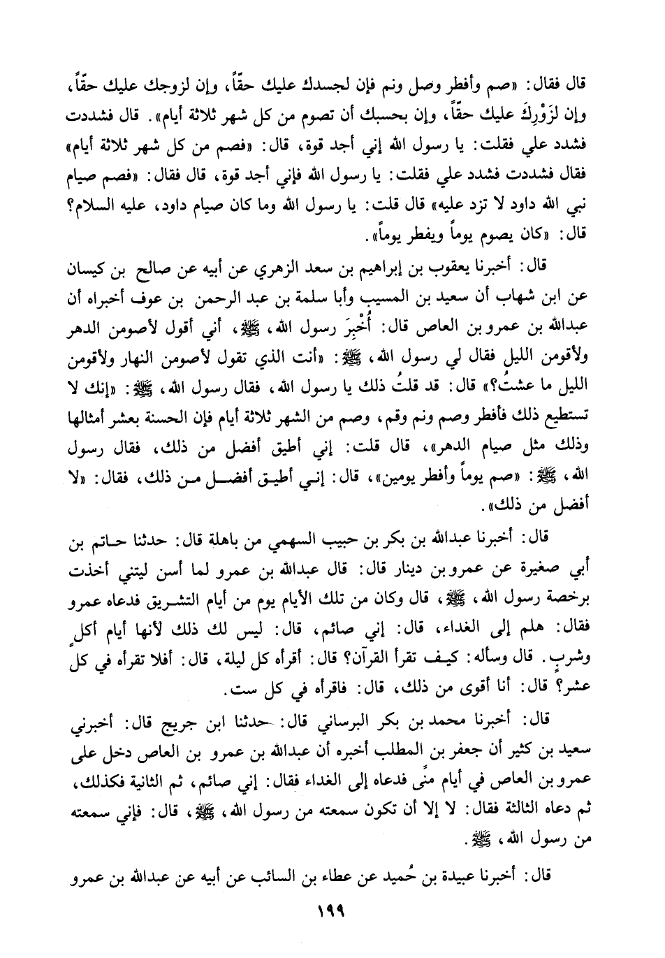 قَالَ: كَانَ يَصُومُ يَوْمًا وَيُفْطِرُ يَوْمًا] . قَالَ: أَخْبَرَنَا يَعْقُوبُ بْنُ إِبْرَاهِيمَ بْنِ سَعْدٍ الزُّهْرِيُّ عَنْ أَبِيهِ عَنْ صَالِحِ بْنِ كَيْسَانَ عَنِ ابْنِ شِهَابٍ أَنَّ سَعِيدَ بْنَ الْمُسَيِّبِ وَأَبَا سَلَمَةَ بْنَ عَبْدِ الرَّحْمَنِ بْنِ عَوْفٍ أَخْبَرَاهُ أَنَّ عَبْدِ اللَّهِ بْنِ عَمْرِو بْنِ الْعَاصِ قَالَ: أُخْبِرَ رَسُولُ اللَّهِ - صَلَّى اللَّهُ عَلَيْهِ وَسَلَّمَ - إِنِّي أَقُولُ لأَصُومَنَّ الدَّهْرَ وَلأَقُومَنَّ اللَّيْلَ [فَقَالَ لِي رسول الله. ص: أَنْتَ الَّذِي تَقُولُ لأَصُومَنَّ النَّهَارَ وَلأَقُومَنَّ اللَّيْلَ مَا عِشْتُ؟ قَالَ: قَدْ قُلْتُ ذَلِكَ يَا رسول الله. فقال رسول الله. ص: إِنَّكَ لا تَسْتَطِيعُ ذَلِكَ فَأَفْطِرْ وَصُمْ وَنَمْ وَقُمْ. وَصُمْ مِنَ الشَّهْرِ ثَلاثَةَ أَيَّامٍ فَإِنَّ الْحَسَنَةَ بِعَشْرِ أَمْثَالِهَا وَذَلِكَ مِثْلُ صِيَامِ الدَّهْرِ. قَالَ قُلْتُ: إِنِّي أُطِيقُ أَفْضَلَ مِنْ ذَلِكَ. فقال رسول الله. ص: صُمْ يَوْمًا وَأَفْطِرْ يَوْمَيْنِ. قَالَ: إِنِّي أُطِيقُ أَفْضَلَ مِنْ ذَلِكَ. فَقَالَ: لا أَفْضَلَ مِنْ ذَلِكَ] .