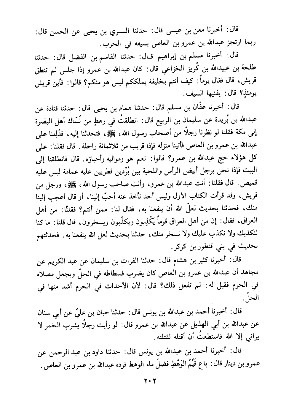 قَالَ: أَخْبَرَنَا عَفَّانُ بْنُ مُسْلِمٍ قَالَ: حَدَّثَنَا هَمَّامُ بْنُ يَحْيَى قَالَ: حَدَّثَنَا قَتَادَةُ عَنْ عَبْدِ اللَّهِ بْنِ بُرَيْدَةَ عَنْ سُلَيْمَانَ بْنِ الرَّبِيعِ قَالَ: انْطَلَقْتُ فِي رَهْطٍ مِنْ نُسَّاكِ أَهْلِ الْبَصْرَةِ إِلَى مَكَّةَ فَقُلْنَا لَوْ نَظَرْنَا رَجُلا مِنْ أَصْحَابِ رَسُولِ اللَّهِ - صَلَّى اللَّهُ عَلَيْهِ وَسَلَّمَ - فَتَحَدَّثْنَا إِلَيْهِ. فَدُلِلْنَا عَلَى عَبْدِ اللَّهِ بْنِ عَمْرِو بْنِ الْعَاصِ فَأَتَيْنَا مَنْزِلَهُ فَإِذَا قَرِيبٌ مِنْ ثَلاثِمِائَةِ رَاحِلَةٍ. قَالَ فَقُلْنَا: عَلَى كُلِّ هَؤُلاءِ حَجَّ عَبْدُ اللَّهِ بْنُ عَمْرٍو؟ قَالُوا: نَعَمْ هُوَ وَمَوَالِيهِ وَأَحِبَّاؤُهُ. قَالَ فَانْطَلَقْنَا إِلَى الْبَيْتِ فَإِذَا نَحْنُ بِرَجُلٍ أَبْيَضَ الرَّأْسِ وَاللِّحْيَةِ بَيْنَ بُرْدَيْنِ قِطْرِيَّيْنِ عَلَيْهِ عِمَامَةٌ لَيْسَ عَلَيْهِ قَمِيصٌ. قَالَ فَقُلْنَا: أَنْتَ عَبْدُ اللَّهِ بْنُ عَمْرٍو. وَأَنْتَ صَاحِبُ رَسُولِ اللَّهِ - صَلَّى اللَّهُ عَلَيْهِ وَسَلَّمَ - وَرَجُلٌ مِنْ قُرَيْشٍ. وَقَدْ قَرَأْتَ الْكِتَابَ الأَوَّلَ وَلَيْسَ أَحَدٌ نَأْخُذُ عَنْهُ أَحَبُّ إِلَيْنَا. أَوْ قَالَ أَعْجَبُ إِلَيْنَا مِنْكَ. فَحَدِّثْنَا بِحَدِيثٍ لَعَلَّ اللَّهَ أَنْ يَنْفَعَنَا بِهِ. فَقَالَ لَنَا: مِمَّنْ أَنْتُمْ؟ فَقُلْنَا: مِنْ أَهْلِ الْعِرَاقِ. فَقَالَ: إِنَّ مِنْ أَهْلِ الْعِرَاقِ قَوْمًا يَكْذِبُونَ وَيُكَذِّبُونَ وَيَسْخَرُونَ. قَالَ قُلْنَا: مَا كُنَّا لِنُكَذِّبُكَ وَلا نَكْذِبُ عَلَيْكَ وَلا نَسْخَرُ منك. حدثنا بحديث لعل الله ينفعنا به. فحدثتهم بِحَدِيثٍ فِي بَنِي قِنْطُورِ بْنِ كَرْكَرَ.