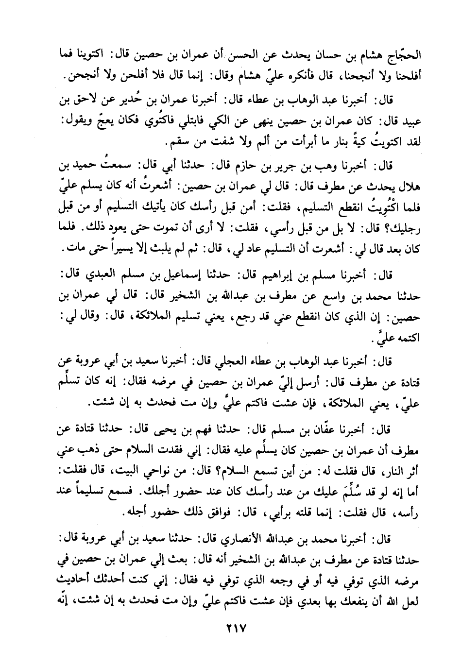 قَالَ: أَخْبَرَنَا عَفَّانُ بْنُ مُسْلِمٍ قَالَ: حَدَّثَنَا فهم بْنُ يَحْيَى قَالَ: حَدَّثَنَا قَتَادَةُ عَنْ مُطَرِّفٍ أَنَّ عِمْرَانَ بْنَ حُصَيْنٍ كَانَ يُسَلَّمُ عَلَيْهِ فَقَالَ: إِنِّي فَقَدْتُ السَّلامَ حَتَّى ذَهَبَ عَنِّي أَثَرُ النَّارِ. قَالَ فَقُلْتُ لَهُ: مِنْ أَيْنَ تَسْمَعُ السَّلامَ؟ قَالَ: مِنْ نَوَاحِي الْبَيْتِ. قَالَ فَقُلْتُ: