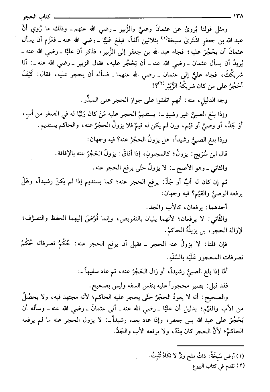 ومثل قولنا يُروى عن عثمان وعلي والزبير- رضي الله عنهم- وذلك ما روي أن عبد الله بن جعفر اشترى سبخة بثلاثين ألفاً، فبلغ علياً- رضي الله عنه- فعزم أني سأل عثمان أن يحجر عليه؛ فجاء عبد الله بن جعفر إلى الزبير، فذكر أن علياً- رضي الله عنه- يُريد أن يسأل عثمان- رضي الله عنه- أن يحجر عليه، فقال الزبير- رضي الله عنه-: أنا شريكك، فجاء علي إلى عثمان- رضي الله عنهما- فسأله أن يحجر عليه، فقال: كيف أحجر على من كان شريكه الزبير؟!