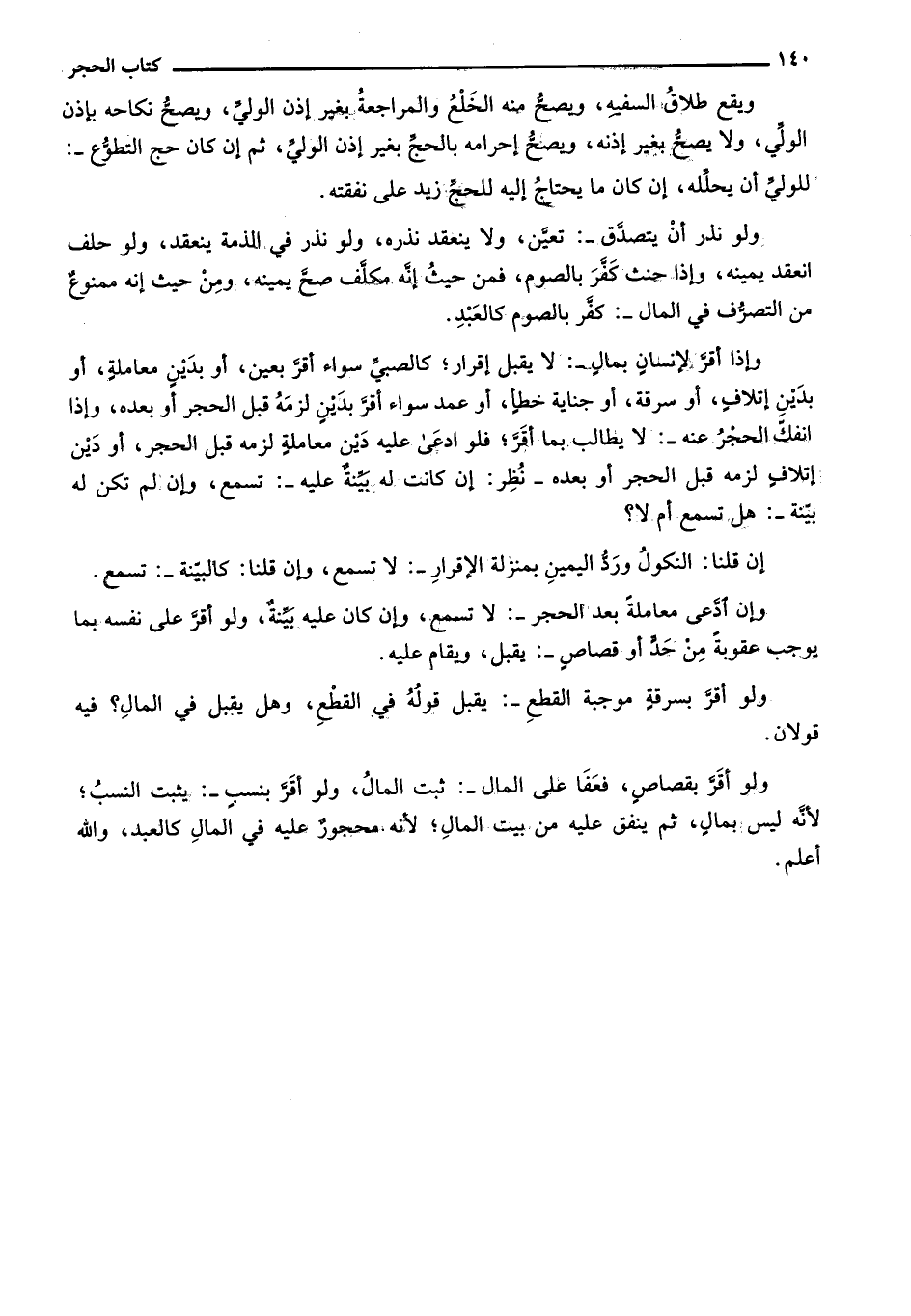 وإذا أقر لإنسان بمال-: لا يقبل إقرار؛ كالصبي سواء أقر بعين، أو بدين معاملة، أو بدين إتلاف، أو سرقة، أو جناية خطأ، أو عمد سواء أقر بدين لزمه قبل الحجر أو بعده، وإذا انفك الحجر عنه-: لا يطالب بما أقر؛ فلو ادعى عليه دين معاملة لزمه قبل الحجر، أو دين إتلاف لزمه قبل الحجر أو بعده- نُظر: إن كانت له بينة عليه-: تسمع، وإن لم تكن له بينة-: هل تسمع أم لا؟