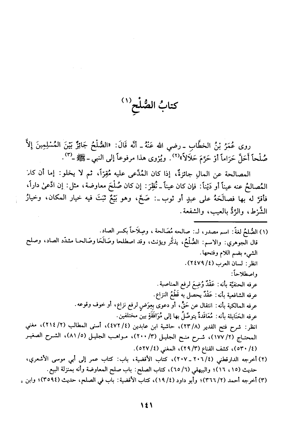 روى عمر بن الخطاب- رضي الله عنه- أنه قال: "الصلح جائز بين المسلمين إلا صلحاً أحل حراماً أو حرم حلالاً". ويُروى هذا مرفوعاً إلى النبي- صلى الله عليه وسلم-.