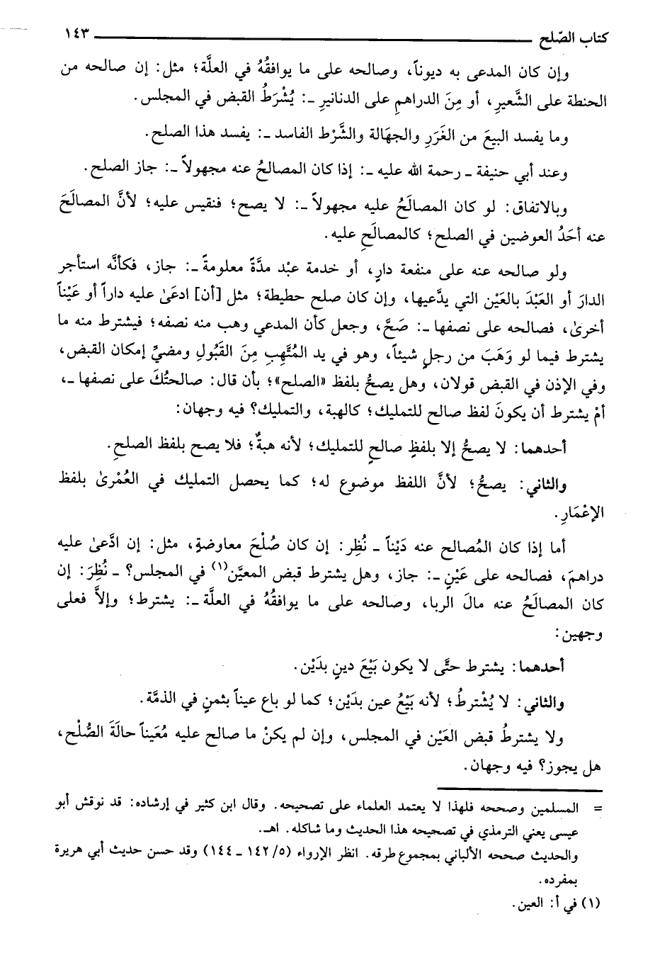 أما إذا كان المُصالح عنه ديناً- نُظر: إن كان صلح معاوضة، مثل: إن ادعى عليه دراهم، فصالحه على عين-: جاز، وهل يشترط قبض المعيَّن في المجلس؟ - نُظر: إن كان المصالح عنه مال الربا، وصالحه على ما يوافقه في العلة-: يشترط؛ وإلا فعلى وجهين:
