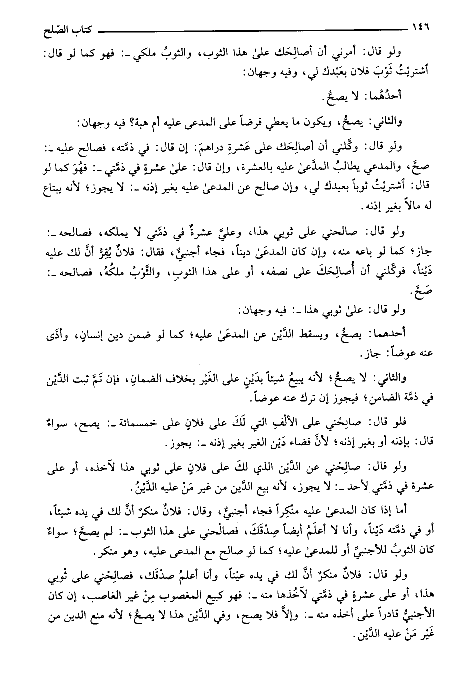 ولو قال: صالحني على ثوبي هذا، وعليَّ عشرة في ذمتي لا يملكه، فصالحه-: جاز؛ كما لو باعه منه، وإن كان المدعى ديناً، فجاء أجنبي، فقال: فلان يقر أن لك عليه ديناً، فوكلني أن أصالحك على نصفه، أو على هذا الثوب، والثوب ملكه، فصالحه-: صح.
