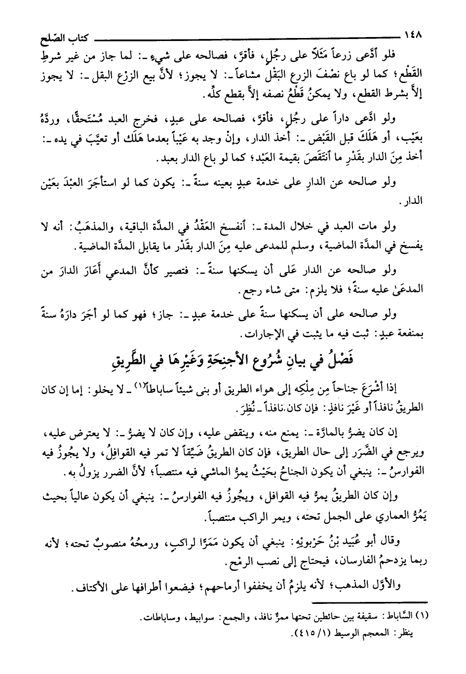 إذا أشرع جناحاً من ملكه إلى هواء الطريق أو بنى شيئاً ساباطاً- لا يخلو: إما إن كان الطريق نافذاً أو غير نافذٍ: فإن كان نافذاً- نُظر.
