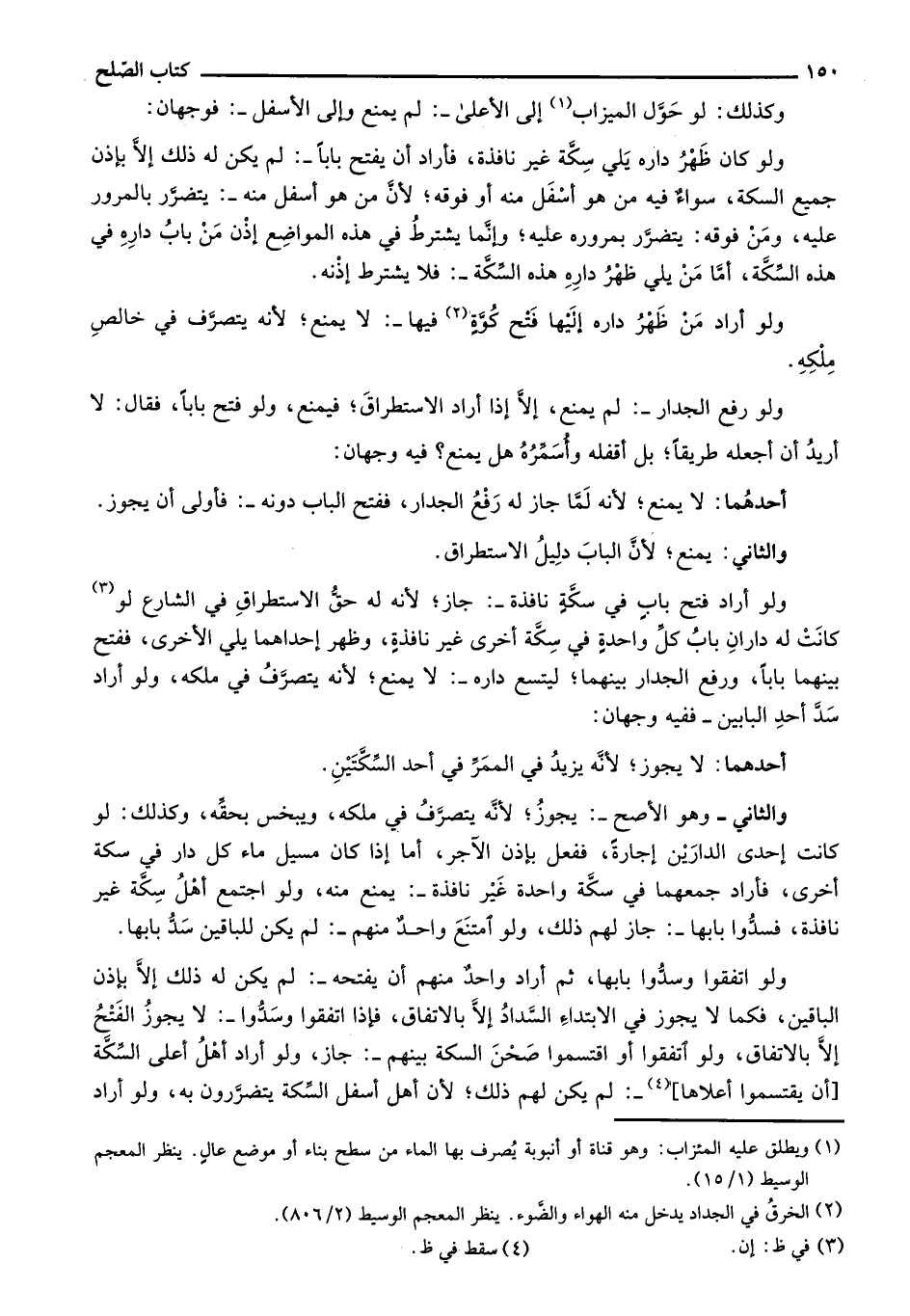 ولو كان ظهر داره يلي سكة غير نافذة، فأراد أن يفتح باباً-: لم يكن له ذلك إلا بإذن جميع السكة، سواءٌ فيه من هو أسفل منه أو فوقه؛ لأن من هو أسفل منه-: يتضرر بالمرور عليه، ومن فوقه: يتضرر بمروره عليه؛ وإنما يشترط في هذه المواضع إذن من باب داره في هذه السكة، أما من يلي ظهر داره هذه السكة-: فلا يشترط إذنه.