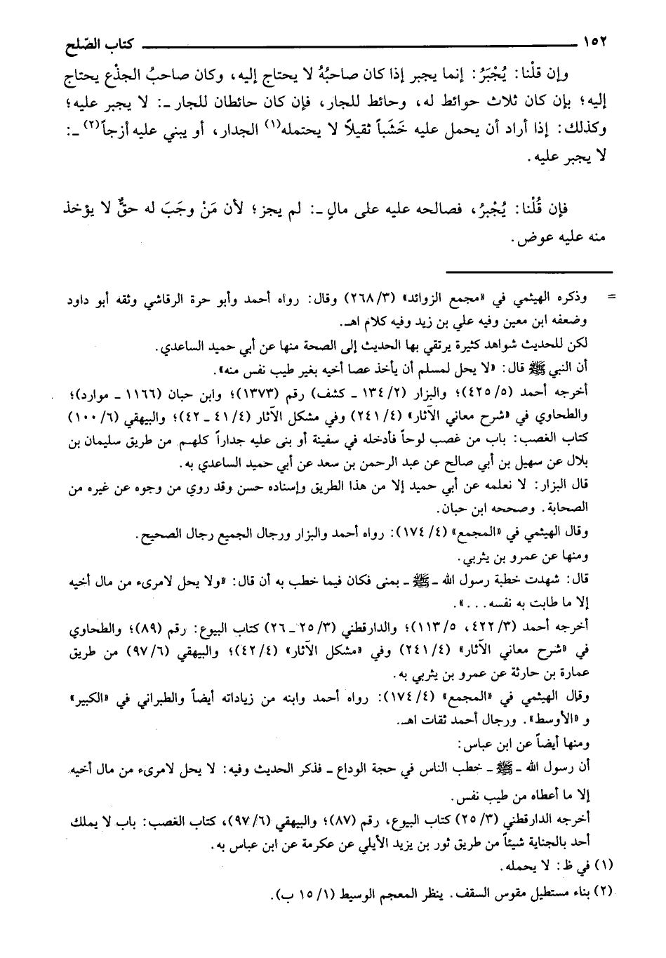 وإن قلنا: يجبر: إنما يجبر إذا كان صاحبه لا يحتاج إليه، وكان صاحب الجذع يحتاج إليه؛ بأن كان ثلاث حوائط له، وحائط للجار، فإن كان حائطان للجار-: لا يجبر عليه؛ وكذلك: إذا أراد أن يحمل عليه خشباً ثقيلاً لا يحتمله الجدار، أو يبني عليه أزجاً-: لا يجبر عليه.