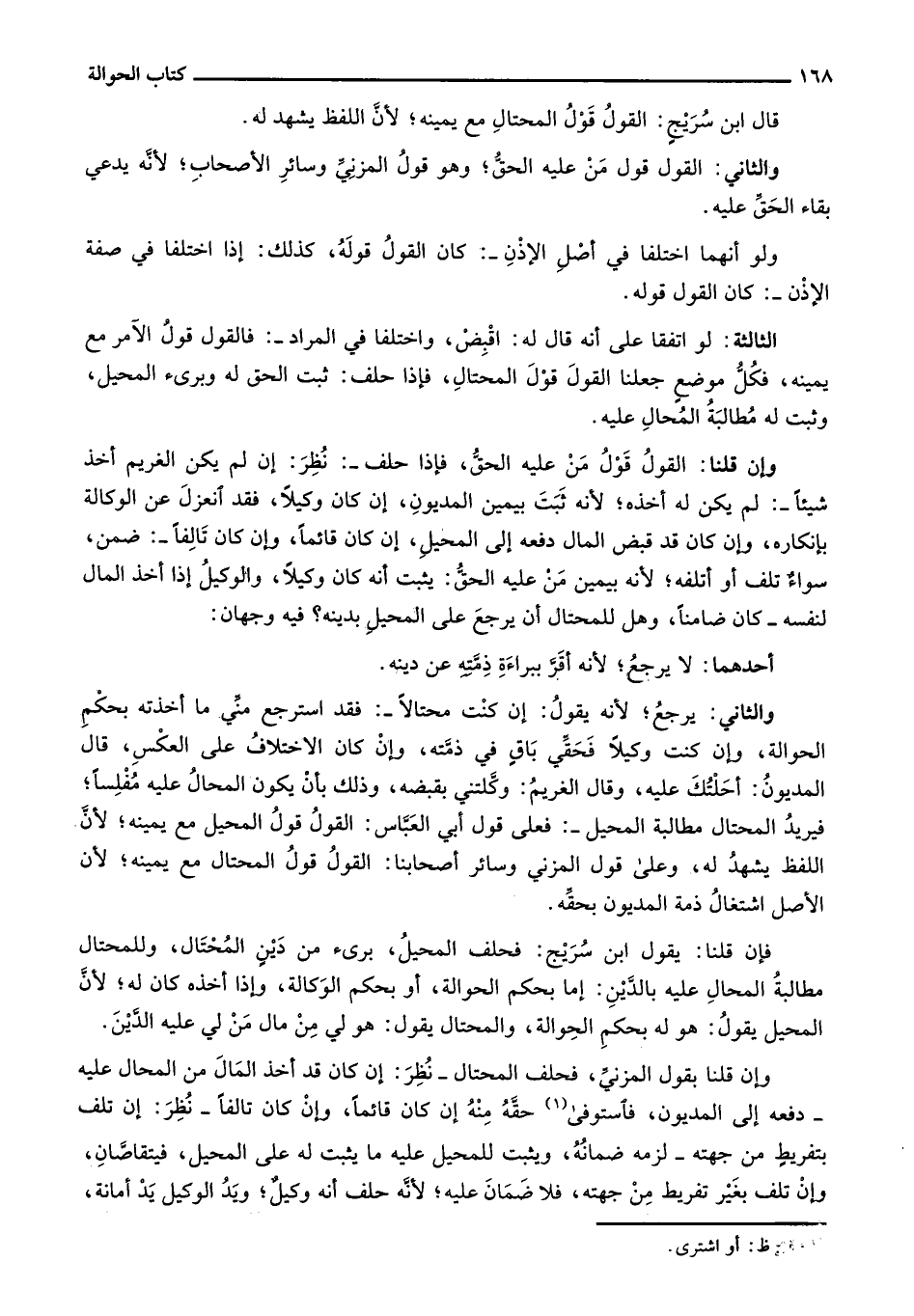 والثاني: يرجع؛ لأنه يقول: إن كنت محتالاً-: فقد استرجع مني ما أخذته بحكم الحوالة، وإن كنت وكيلاً فحقي باق في ذمته، وإن كان الاختلاف على العكس، قال المديون: أحلتك عليه، وقال الغريم: وكلتني بقبضه، وذلك بأن يكون المحال عليه مفلساً؛ فيريد المحتال مطالبة المحيل-: فعلى قول أبي العباس: القول قول المحيل مع يمينه؛ لأن اللفظ يشهد له، وعلى قول المزني وسائر أصحابنا: القول قول المحتال مع يمينه؛ لأن الأصل اشتغال ذمة المديون بحقه.