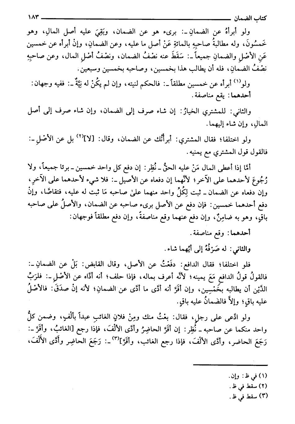 ولو أبرأه عن الضمان-: برئ هو عن الضمان، وبقي عليه أصل المال، وهو خمسون، وله مطالبة صاحبه بالمائة عن أصل ما عليه، وعن الضمان، وإن أبرأه عن خمسين عن الأصل والضمان جميعاً-: سقط عنه نصف الضمان، ونصف أصل المال، وعن صاحبه نصف الضمان، فله أن يطالب هذا بخمسين، وصاحبه بخمسين وسبعين.