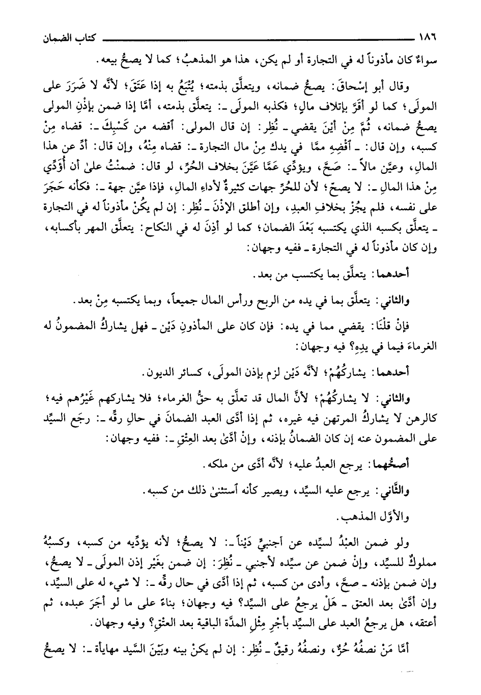 وقال أبو إسحاق: يصح ضمانه، ويتعلق بذمته؛ يتبع به إذا عتق؛ لأنه لا ضرر على المولى؛ كما لو أقر بإتلاف مال؛ فكذبه المولى-: يتعلق بذمته، أما إذا ضمن بإذن المولى يصح ضمانه، ثم من أين يقضي- نُظر: إن قال المولى: اقضه من كسبك-: قضاه من كسبه، وإن قال:- اقضه مما في يدك من مال التجارة-: قضاه منه، وإن قال: أدِّ عن هذا المال، وعيَّن مالاً-: صح، ويؤدي عما عين بخلاف الحُر، لو قال: ضمنت على أن أؤدي من هذا المال-: لا يصح؛ لأن للحر جهات كثيرة لأداء المال، فإذا عين جهة-: فكأنه حجر على نفسه، فلم يجز بخلاف العبد، وإن أطلق الإذن- نُظر: إن لم يكن مأذوناً له في التجارة- يتعلق بكسبه الذي يكتسبه بعد الضمان؛ كما لو أذن له في النكاح: يتعلق المهر بأكسابه، وإن كان مأذوناً له في التجارة- ففيه وجهان: