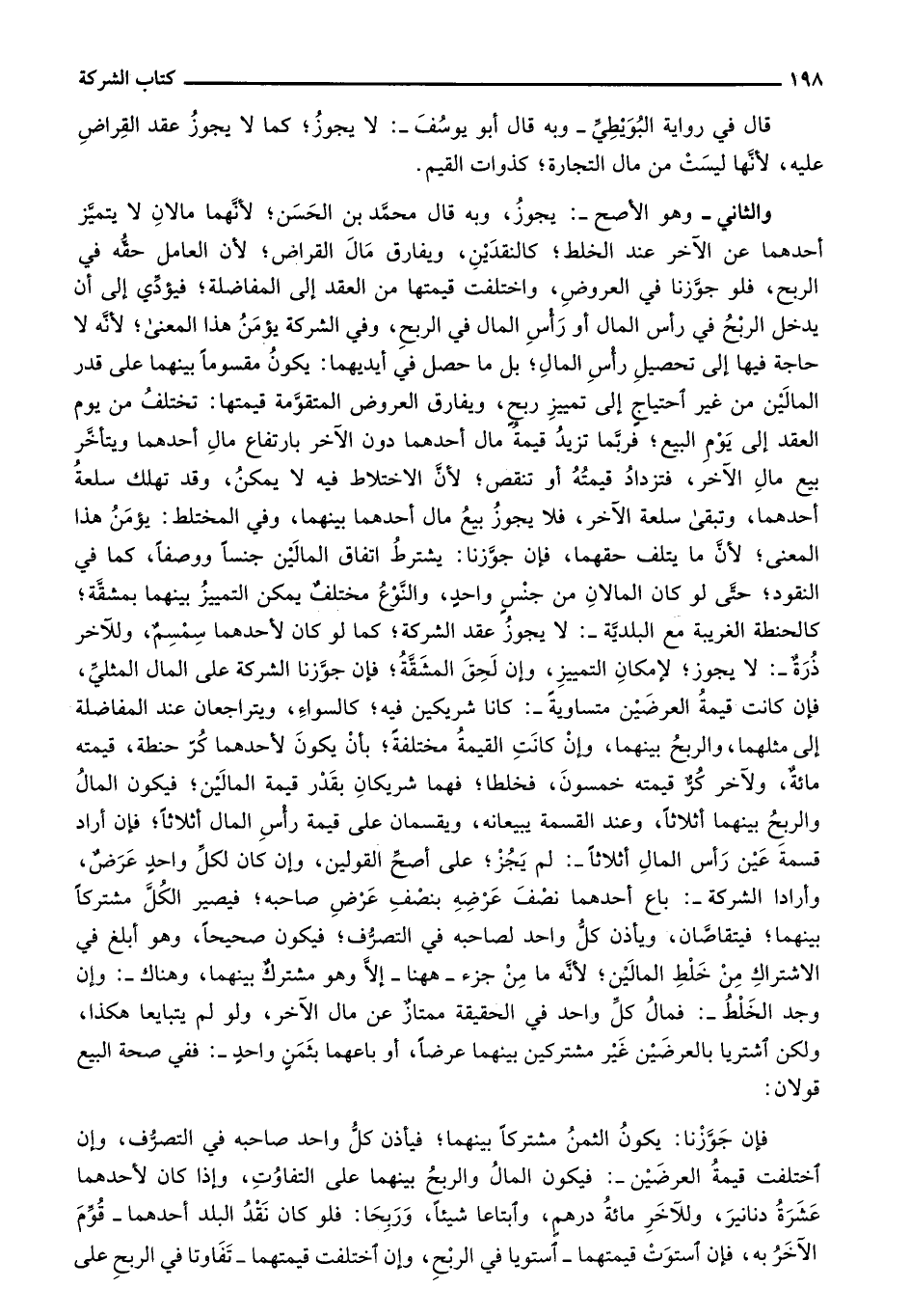 والثاني- وهو الأصح-: يجوز، وبه قال محمد بن الحسن؛ لأنهما مالان لا يتميز أحدهما عن الآخر عند الخلط؛ كالنقدين، ويفارق مال القراض؛ لأن العامل حقه في الربح، فلو جوزنا في العروض، واختلفت قيمتها من العقد إلى المفاضلة؛ فيؤدي إلى أن يدخل الربح في رأس المال أو رأس المال في الربح، وفي الشركة يؤمن هذا المعنى؛ لأنه لا حاجة فيها إلى تحصيل رأس المال؛ بل ما حصل في أيديهما: يكون مقسوماً بينهما على قدر المالين من غير احتياج إلى تمييز ربح، ويفارق العروض المتقومة قيمتها: تختلف من يوم العقد إلى يوم البيع؛ فربما تزيد قيمة مال أحدهما دون الآخر بارتفاع مال أحدهما ويتأخر بيع مال الآخر، فتزداد قيمته أو تنقص؛ لأن الاختلاط فيه لا يمكن، وقد تهلك سلعة أحدهما، وتبقى سلعة الآخر، فلا يجوز بيع مال أحدهما بينهما، وفي المختلط: يؤمن هذا المعنى؛ لأن ما يتلف حقهما، فإن جوزنا: يشترط اتفاق المالين جنساً ووصفاً، كما في النقود؛ حتى لو كان المالان من جنس واحد، والنوع مختلف يمكن التمييز بينهما بمشقة؛ كالحنطة الغريبة مع البلدية-: لا يجوز عقد الشركة؛ كما لو كان لأحدهما سمسمٌ، وللآخر ذُرة-: لا يجوز؛ لإمكان التمييز، وإن لحق المشقة؛ فإن جوزنا الشركة على المال المثلي، فإن كانت قيمة العرضين متساوية-: كانا شريكين فيه؛ كالسواء، ويتراجعان عند المفاضلة إلى مثلهما، والربح بينهما، وإن كانت القيمة مختلفة؛ بأن يكون لأحدهما كُرّ حنطة، قيمته مائة، ولآخر كُرٌّ قيمته خمسون، فخلطا؛ فهما شريكان بقدر قيمة المالين؛ فيكون المال والربح بينهما أثلاثاً، وعند القسمة يبيعانه، ويقسمان على قيمة رأس المال أثلاثاً؛ فإن أراد قسمة عين رأس المال أثلاثاً-: لم يجز؛ على أصح القولين، وإن كان لكل واحد عرضٌ، وأرادا الشركة-: باع أحدهما نصف عرضة بنصف عرض صاحبه؛ فيصير الكل مشتركاً بينهما؛ فيتقاصان، ويأذن كل واحد لصاحبه في التصرف؛ فيكون صحيحاً، وهو أبلغ في الاشتراك من خلط المالين؛ لأنه ما من جزء- ههنا- إلا وهو مشترك بينهما، وهناك-: وإن وجد الخلط-: فمال كل واحد في الحقيقة ممتاز عن مال الآخر، ولو لم يتبايعا هكذا، ولكن اشتريا بالعرضين غير مشتركين بينهما عرضاً، أو باعهما بثمن واحد-: ففي صحة البيع قولان: