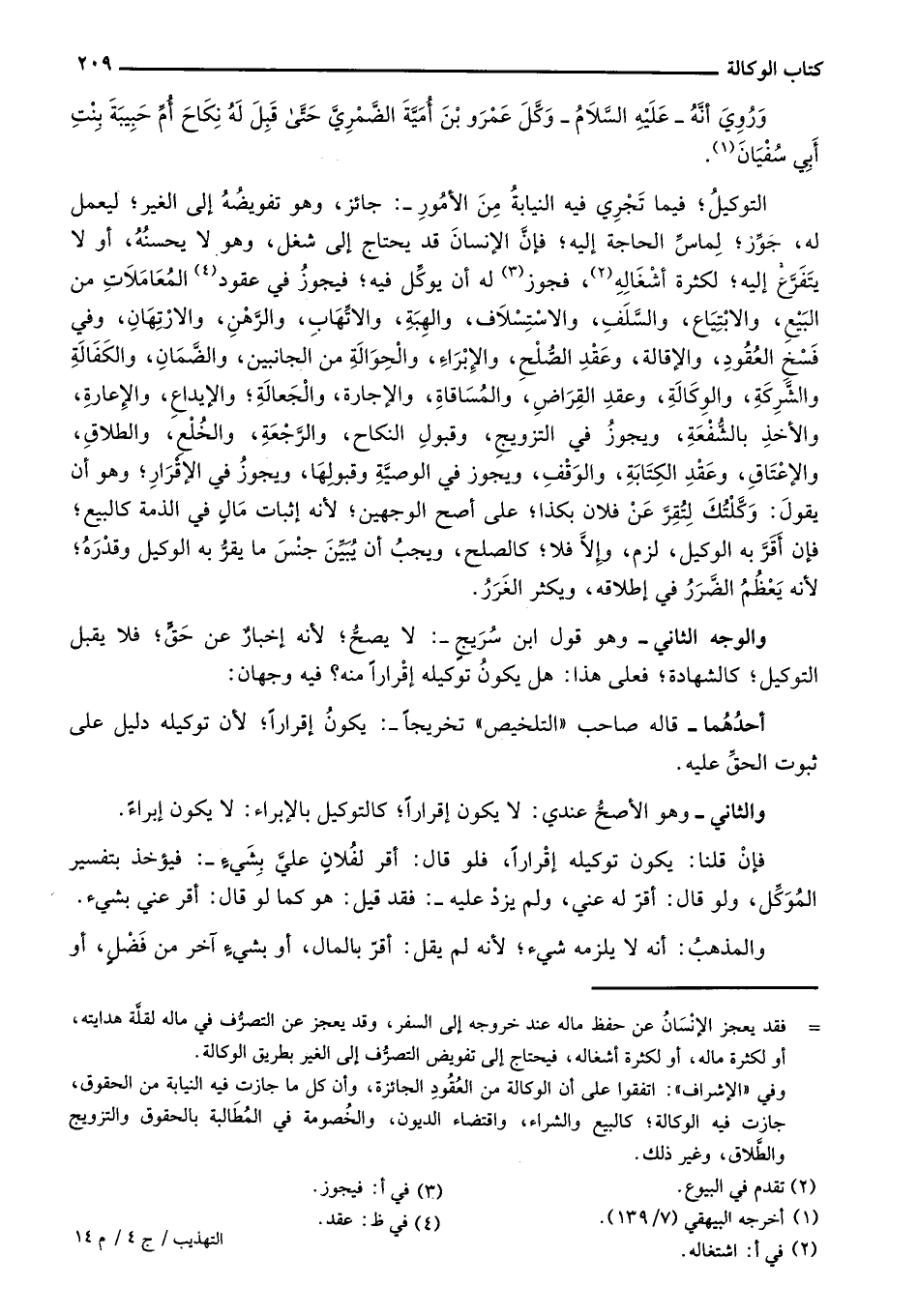 التوكيل؛ فيما تجري فيه النيابة من الأمور: جائز، وهو تفويضه إلى الغير؛ ليعمل له، جوز، لماس الحاجة إليه، فإن الإنسان قد يحتاج إلى شغل، وهو لا يحسنه، أو لا يتفرع إليه، لكثرة أشغاله، فجوز له أن يوكل فيه؛ فيجوز في عقود المعاملات من البيع، والابتياع، والسلف، والاستسلاف، والهبة، والاتهاب، والرهن، والارتهان، وفي فسخ العقود، والإقالة، وعقد الصلح، والإبراء، والحوالة من الجانبين، والضمان، والكفالة والشركة، والوكالة، وعقد القراض، والمساقاة، والإجارة، والجعالة، والإيداع، والإعارة، والأخذ بالشفعة، ويجوز في التزويج، وقبول النكاح، والرجعة، والخلع، والطلاق، والإعتاق، وعقد الكتابة، والوقف، ويجوز في الوصية وقبولها، ويجوز في الإقرار؛ وهو أن يقول: وكلتك لتقر عن فلان بكذا؛ على أصح الوجهين؛ لأنه إثبات مال في الذمة كالبيع؛ فإن أقر به الوكيل، لزم، وإلا فلا؛ كالصلح، ويجب أن يبين جنس ما يقر به الوكيل وقدره، لأنه يعظم الضرر في إطلاقه، ويكثر الغرر.